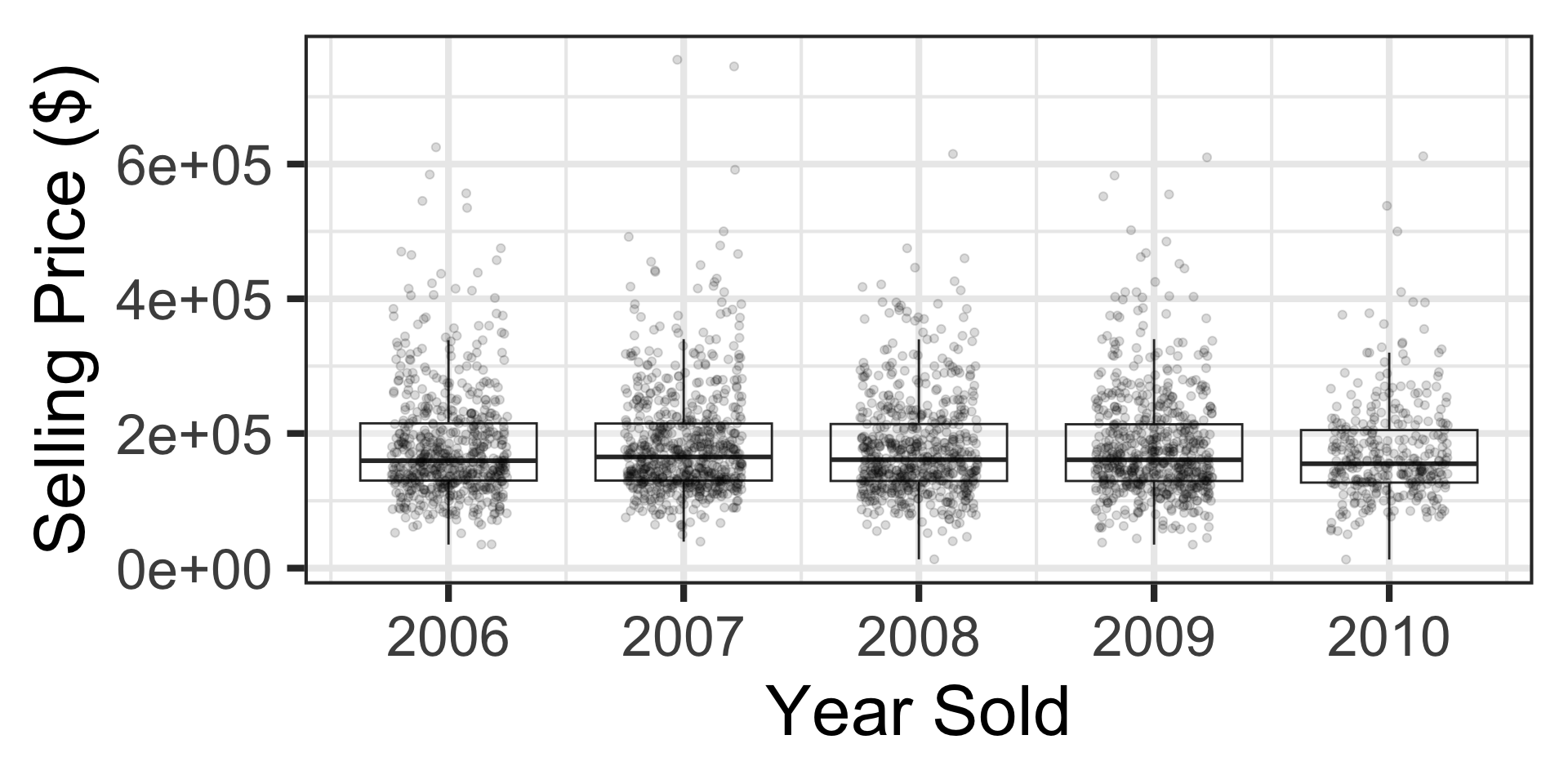 Notice that this model is suggesting that selling prices of homes in Ames, IA got cheaper over the 2006 to 2010 time period – likely a result of the subprime mortgage crisis.