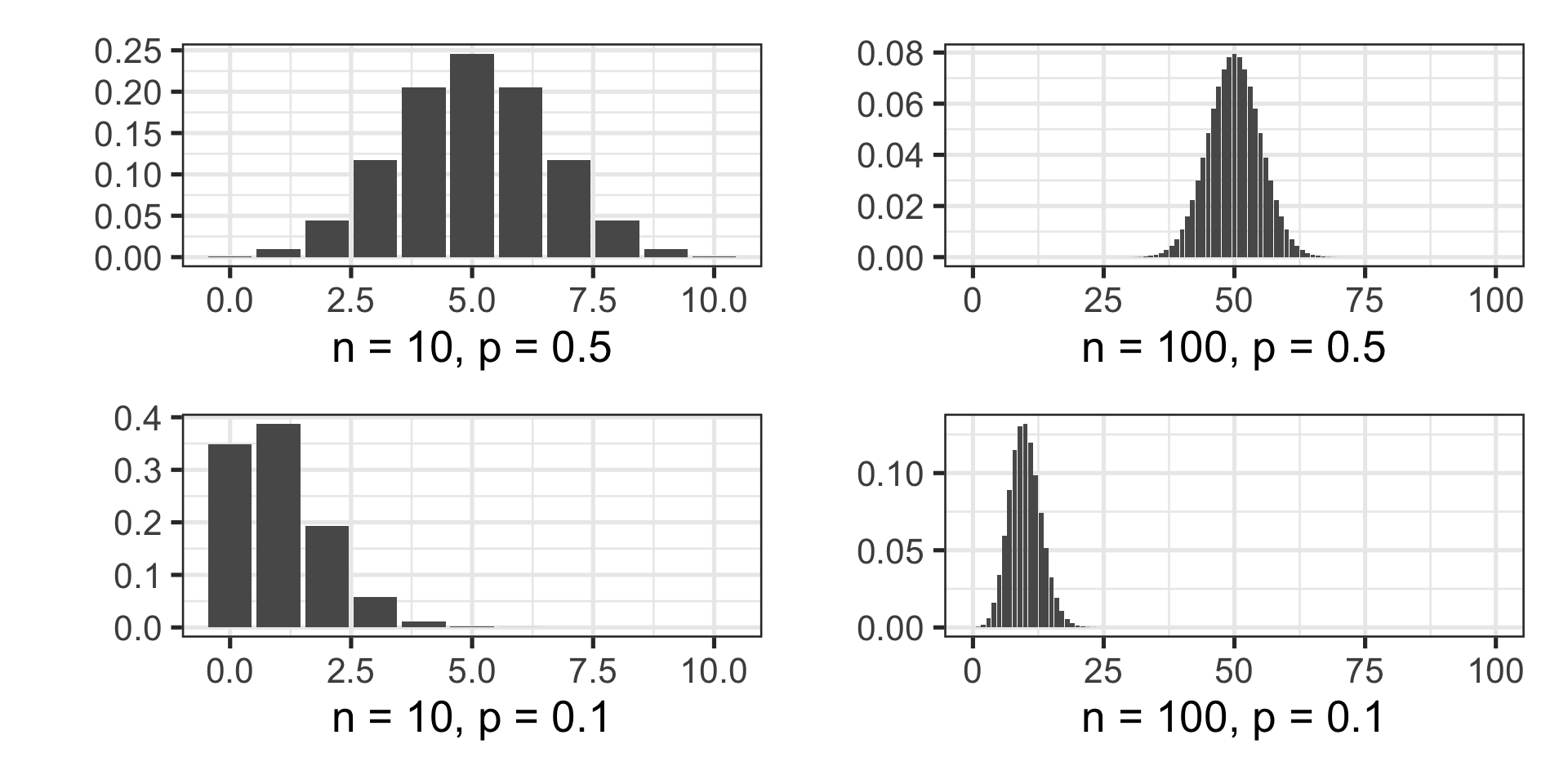 On the previous slide, we saw that the center and spread of the binomial distribution depend on the values of \(n\) and \(p\)