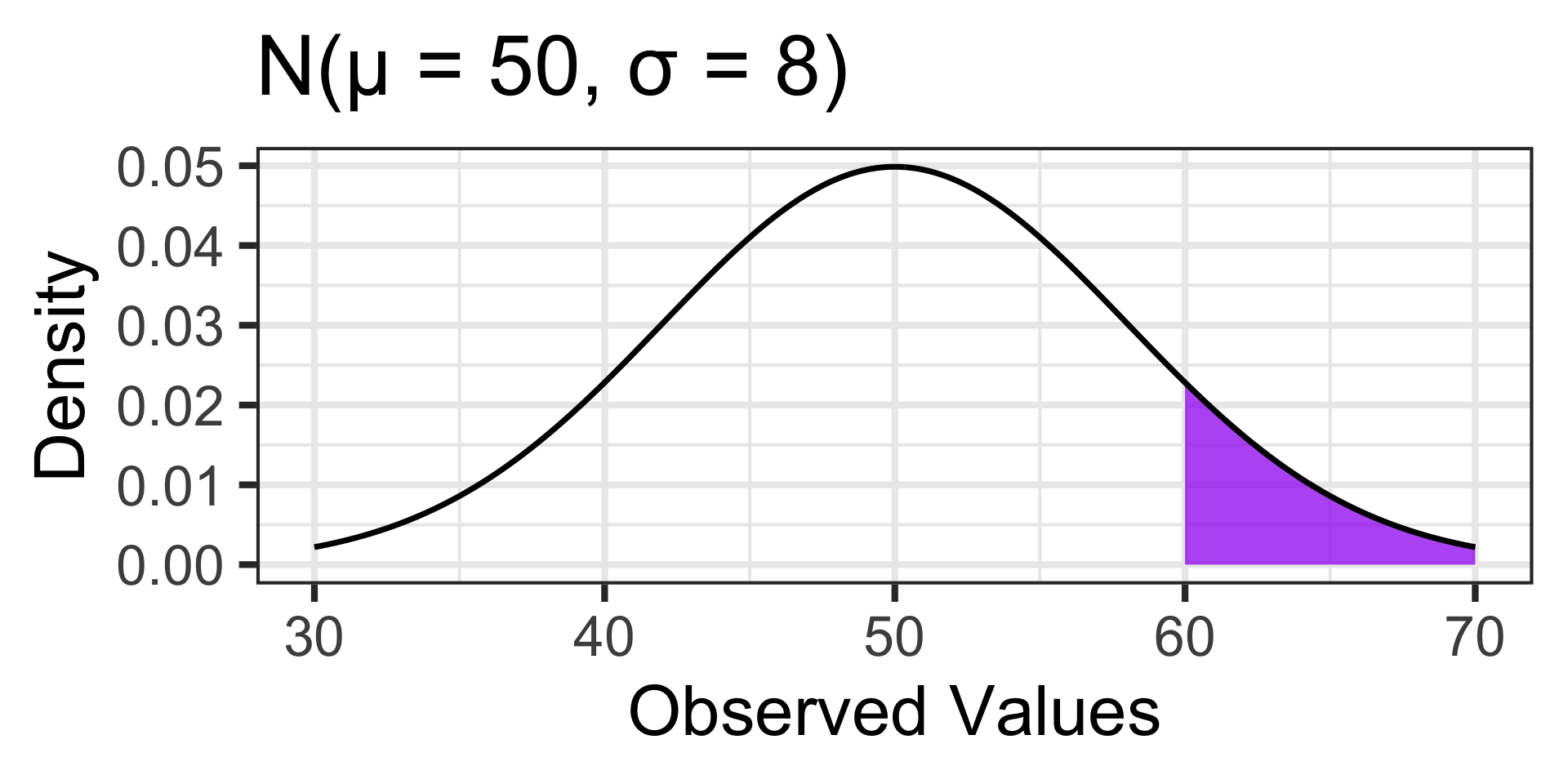 1 - pnorm(60, 50, 8) \(\approx\) 0.1056