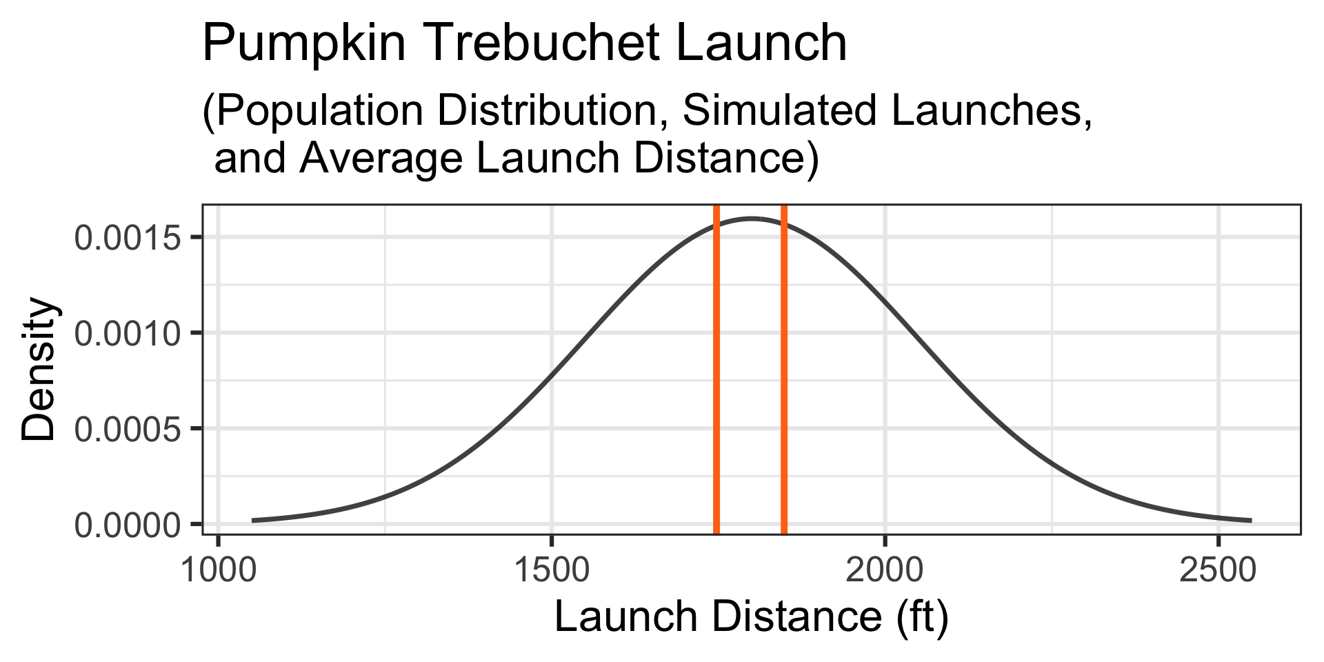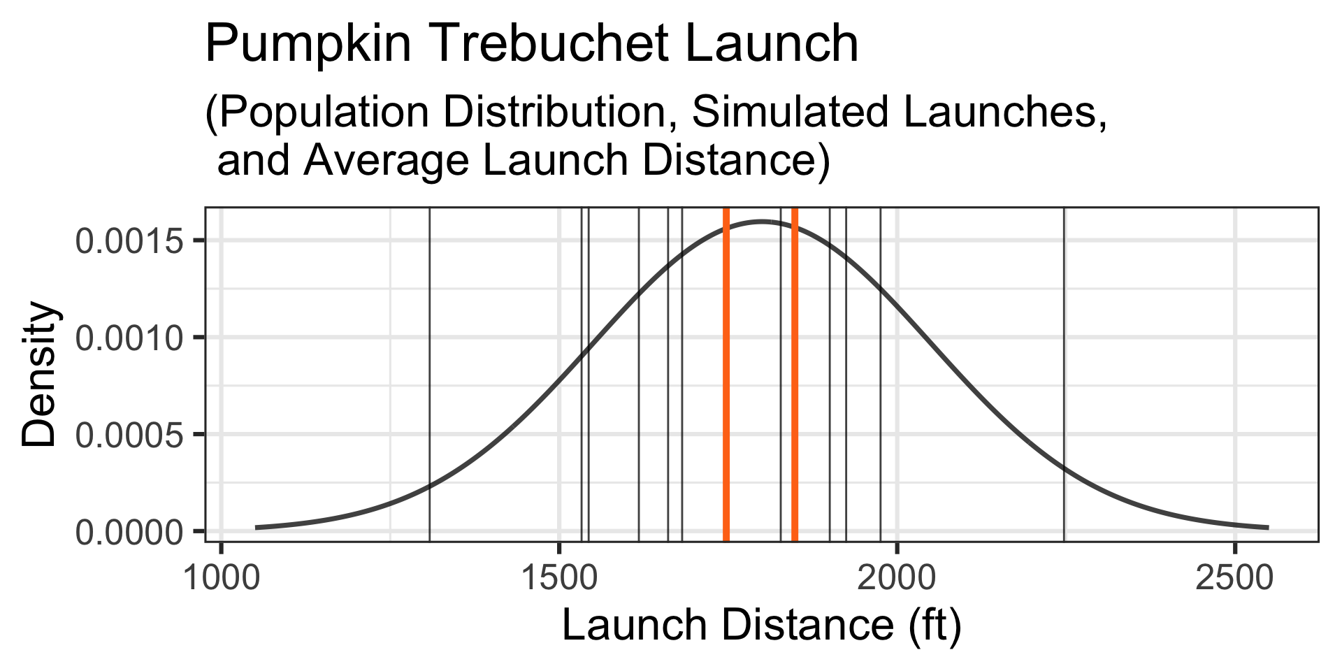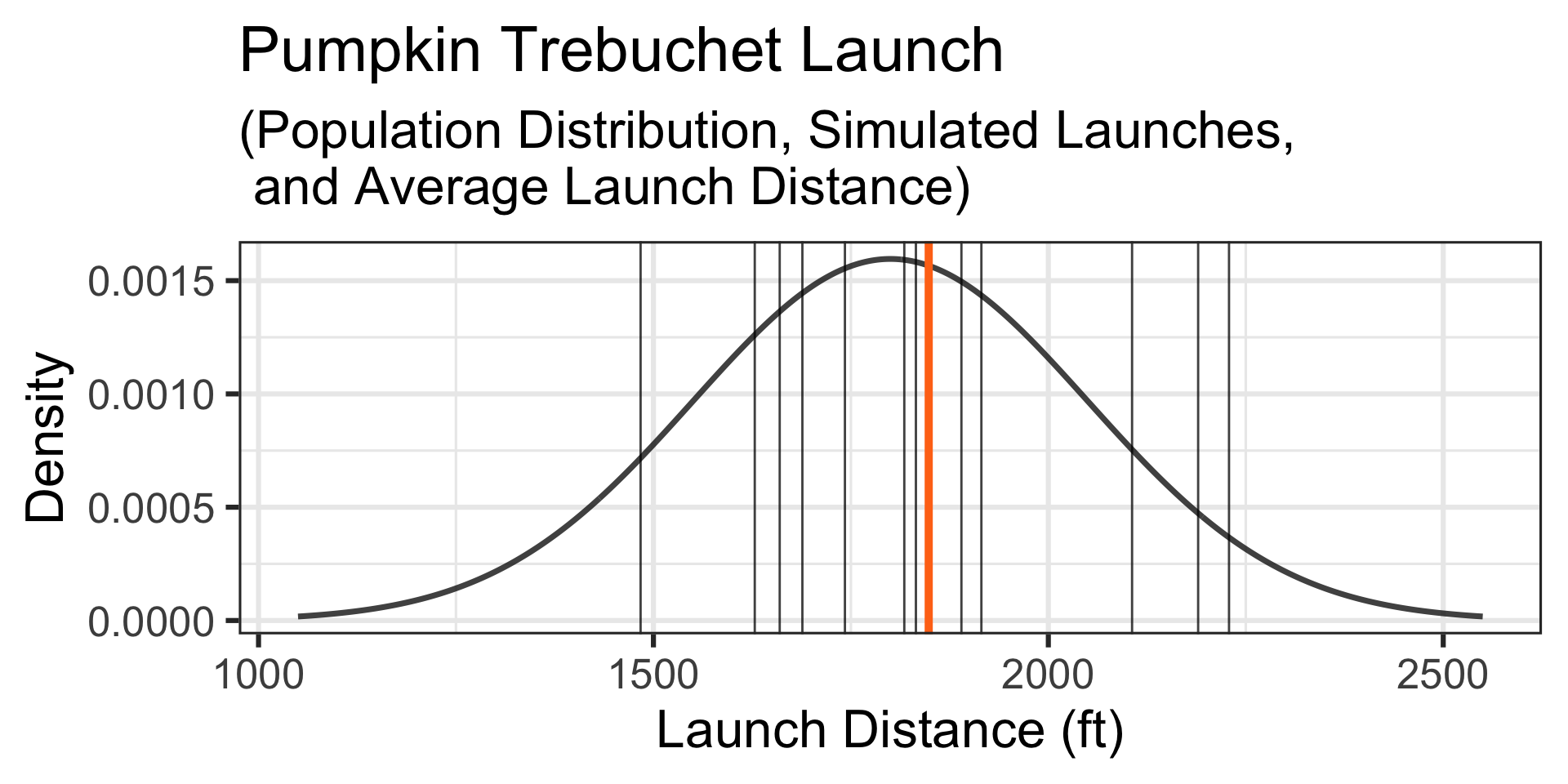 A Simulation: Let’s simulate the launches of 12 randomly selected 10lb pumpkins… The simulated launch distances appear below and the launches, along their average launch distance are shown by the vertical lines on the graph to the right.