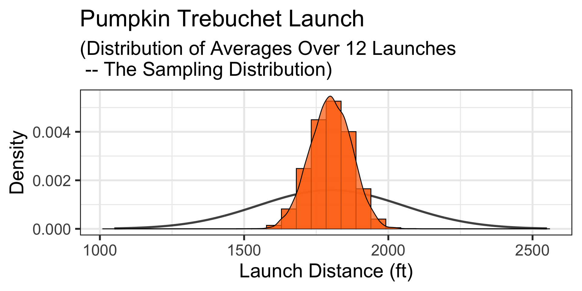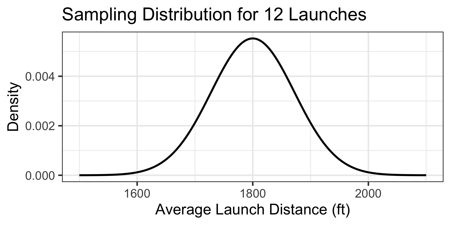 Launch distance is a numerical variable, and so the sampling distribution for average launch distances of 12 pumpkins will be \(\displaystyle{N\left(\mu, S_E = \sigma/\sqrt{n}\right)}\), which in this case is \(\displaystyle{N\left(\mu = 1800, S_E = 250/\sqrt{12}\right)}\)