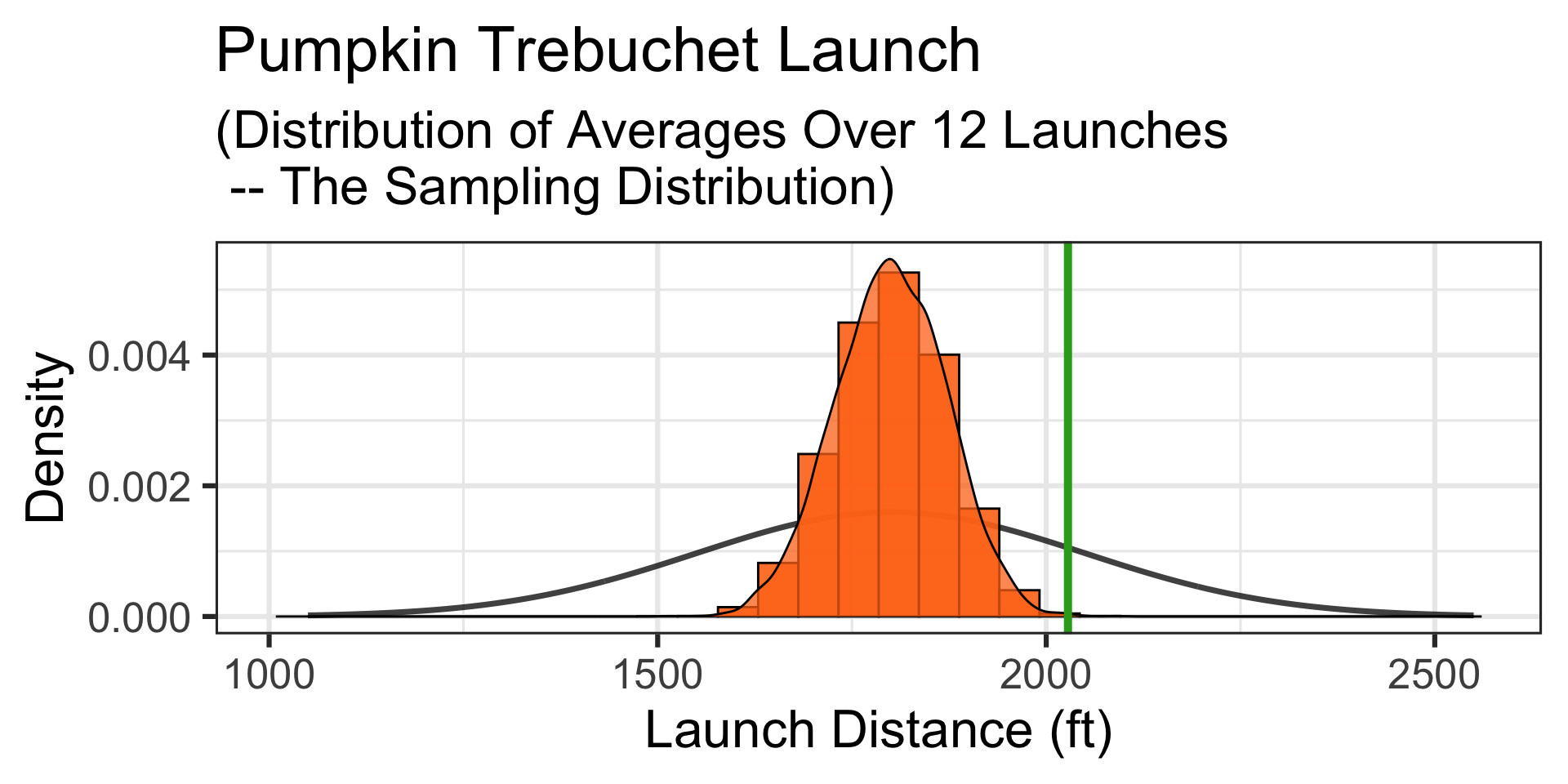 Motivating Example: A particular team feels that their pumpkin launching trebuchet is much better than average. On a typical day (it’s not extra windy), the team launches a random selection of twelve 10lb pumpkins. Their average launch distance is 2,028ft. What is the probability that a random selection of twelve launches averages 2,028ft or further?