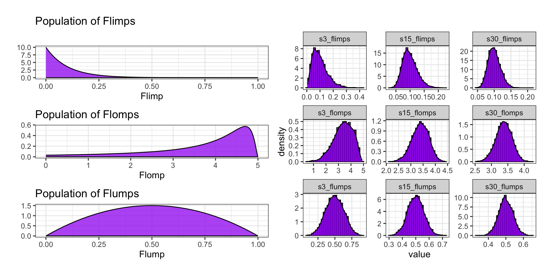 Flimps, flomps, and flumps are [fictitious] numerical variables whose population distributions appear below and with corresponding sampling distributions to the right.