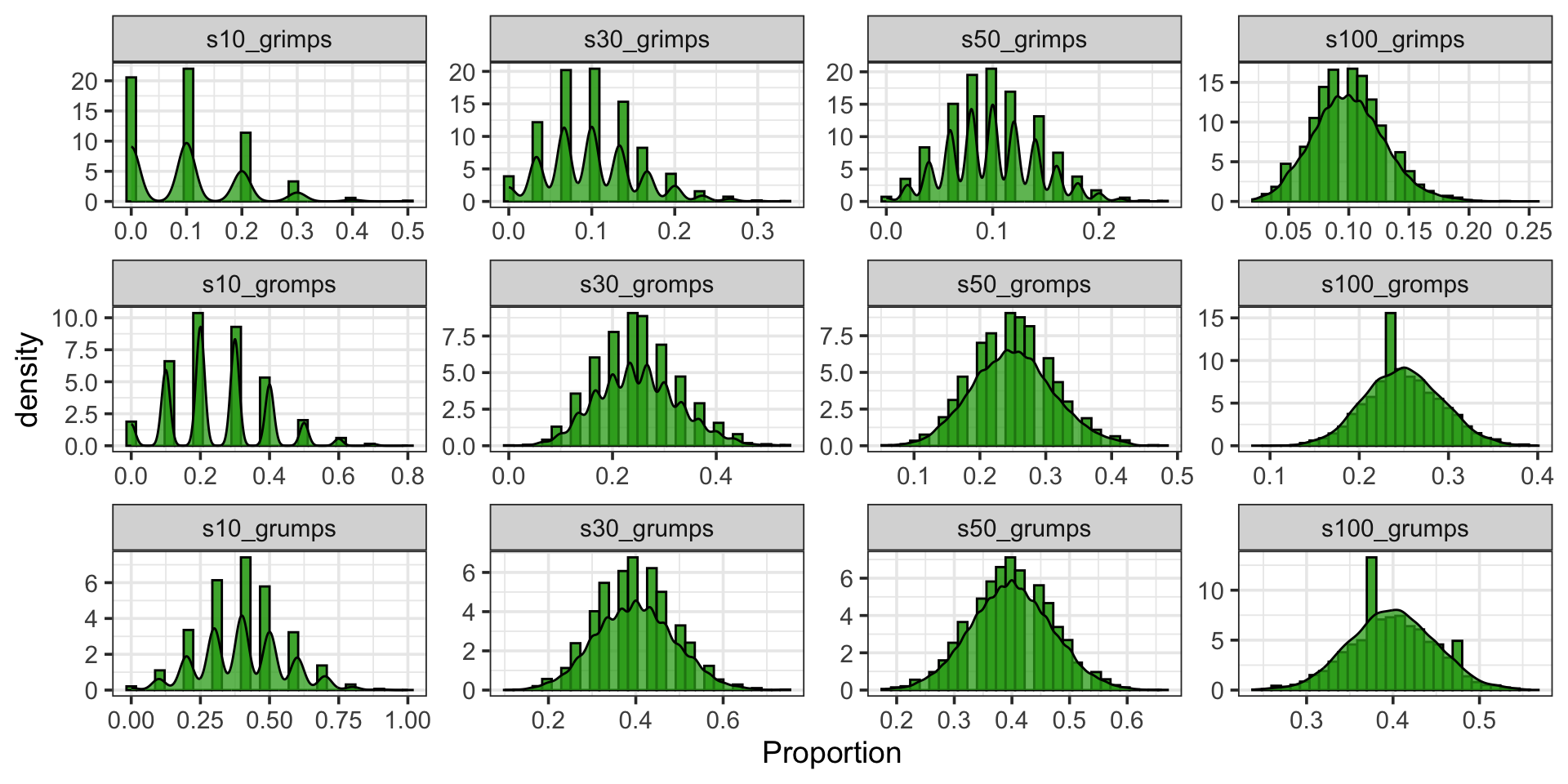 Similarly, grimps, gromps, and grumps are [fictitious] categorical variables for which we can define success and failure. The sampling distributions for proportion corresponding to a successful outcome appears below.