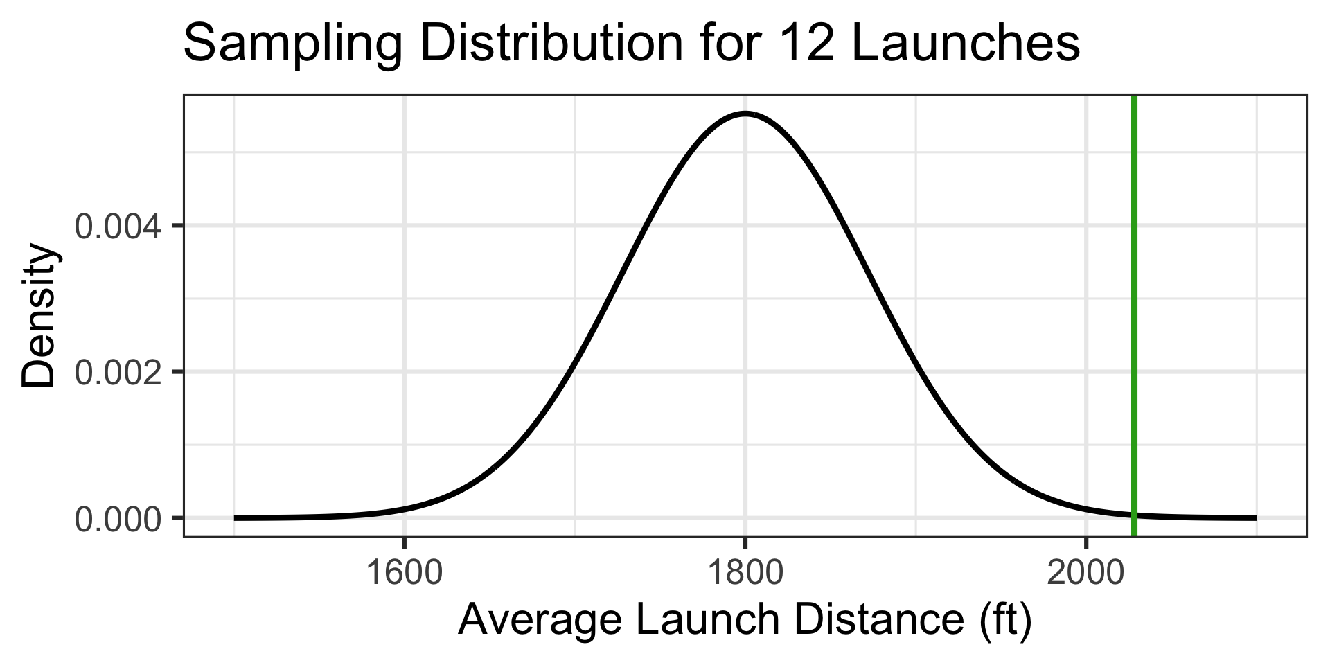 Takeaway: The distribution of averages of 12 launches is much more narrow than the population distribution. The probability of averaging a distance of at least 2,028ft is much lower than the probability of a single launch being at least 2,028ft.