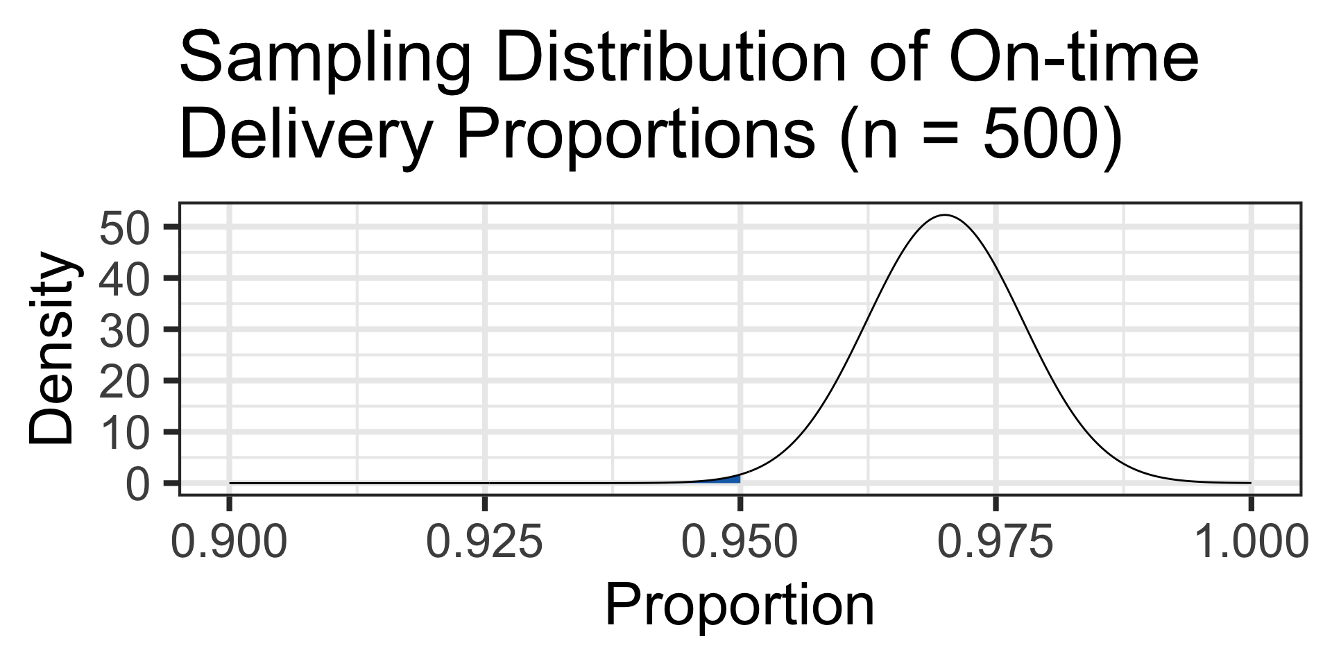 Scenario: A major online retailer, let’s call it “Amazonia”, has an internal benchmark to ensure that at least 97% of its packages are delivered on time. A logistics manager has concerns that a particular distribution center has been falling short of this target. The logistics manager takes a new random sample of 500 recent package deliveries. Out of these, 475 were delivered on time. Assuming that the facility is in compliance with the 97% on-time delivery rate, what is the probability that 95% or fewer packages arrive on time in a random sample of 500 deliveries.