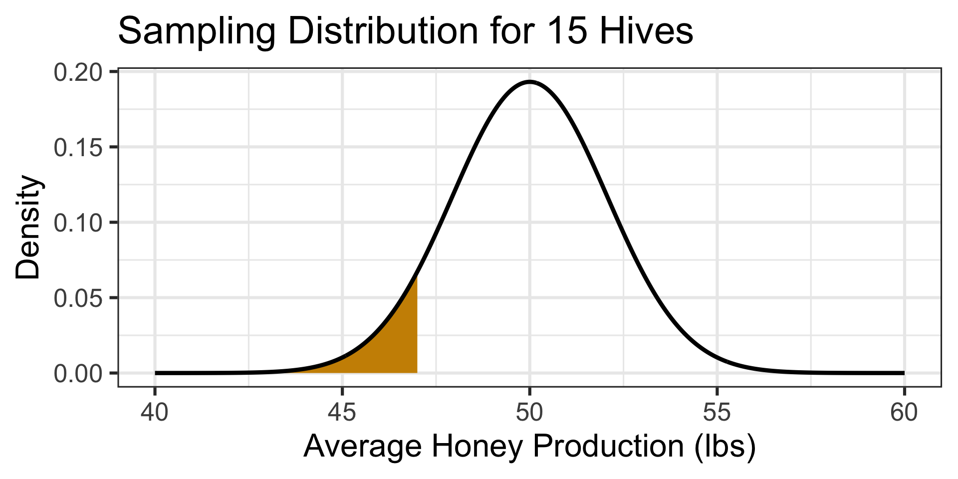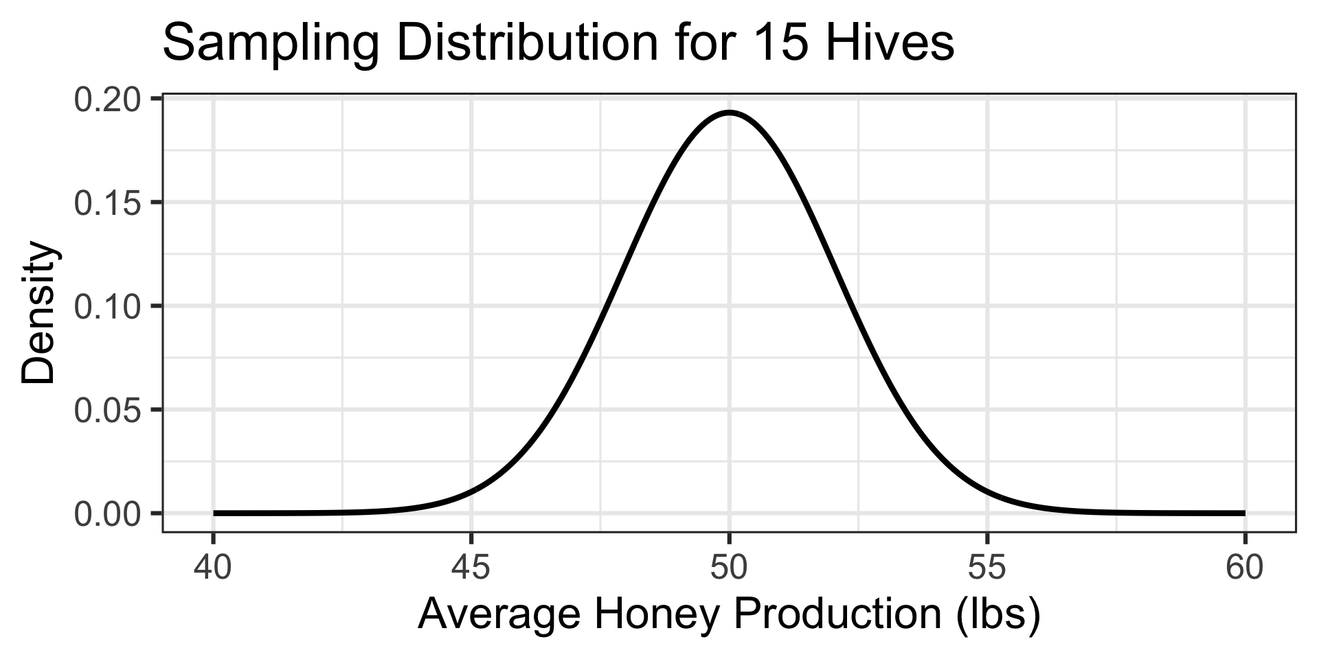 Honey production is a numerical variable, so the sampling distribution of the mean honey production from 15 hives is \(\displaystyle{N\left(\mu, S_E = \sigma/\sqrt{n}\right)}\), which in this case is \(\displaystyle{N\left(\mu = 50, S_E = 8/\sqrt{15}\right)}\).