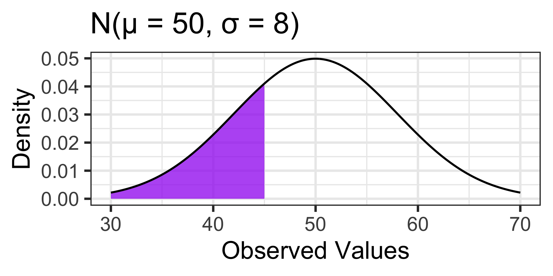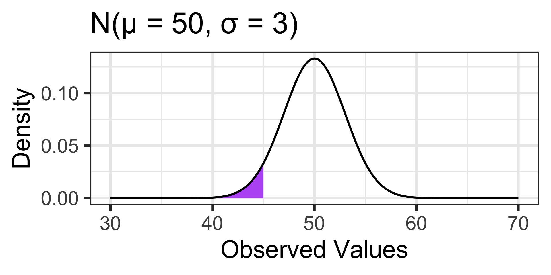 pnorm(45, 50, 3) \(\approx\) 0.0478