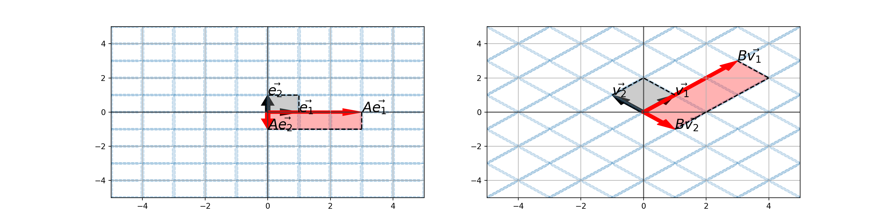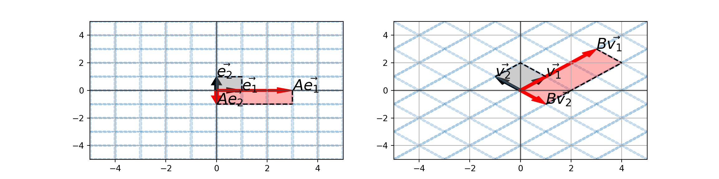 In particular, we’re interested in the parallelograms resulting from the vectors \(A\vec{e_1}\) and \(A\vec{e_2}\) as well as the vectors \(B\vec{v_1}\) and \(B\vec{v_2}\).