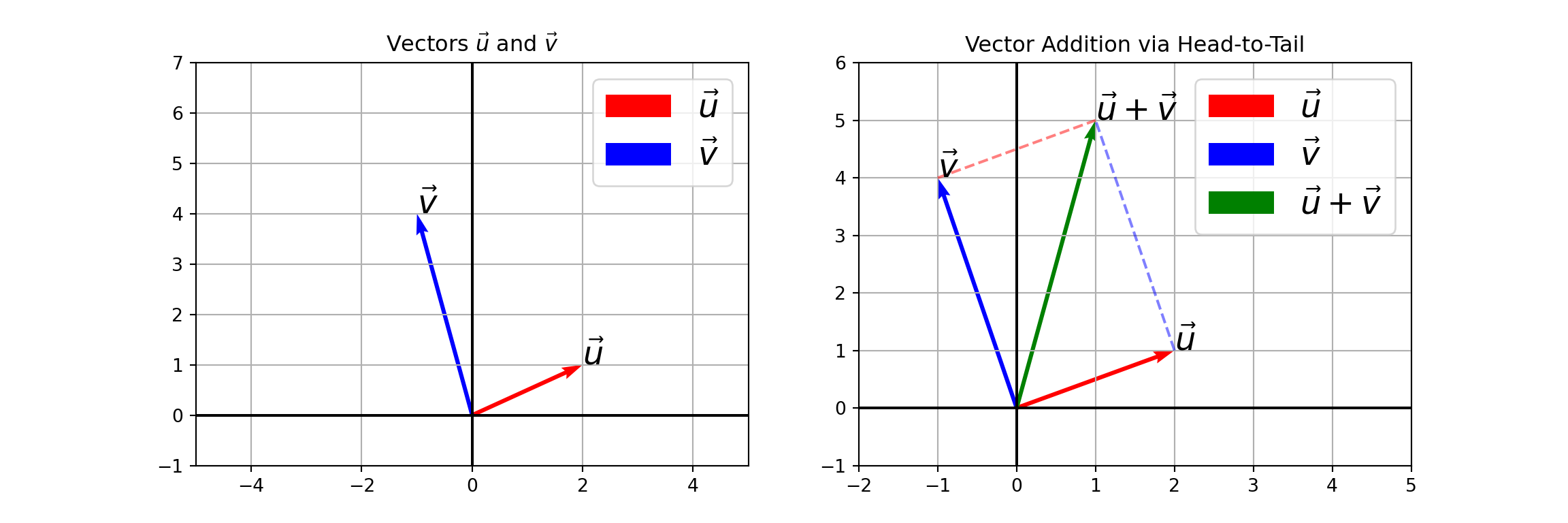 \[\vec{u} + \vec{v} = \begin{bmatrix} u_1 + v_1 \\ u_2 + v_2\\ \vdots \\ u_n + v_n \end{bmatrix} \quad \vec{u} - \vec{v} = \begin{bmatrix} u_1 - v_1 \\ u_2 - v_2\\ \vdots\\ u_n - v_n \end{bmatrix}\]