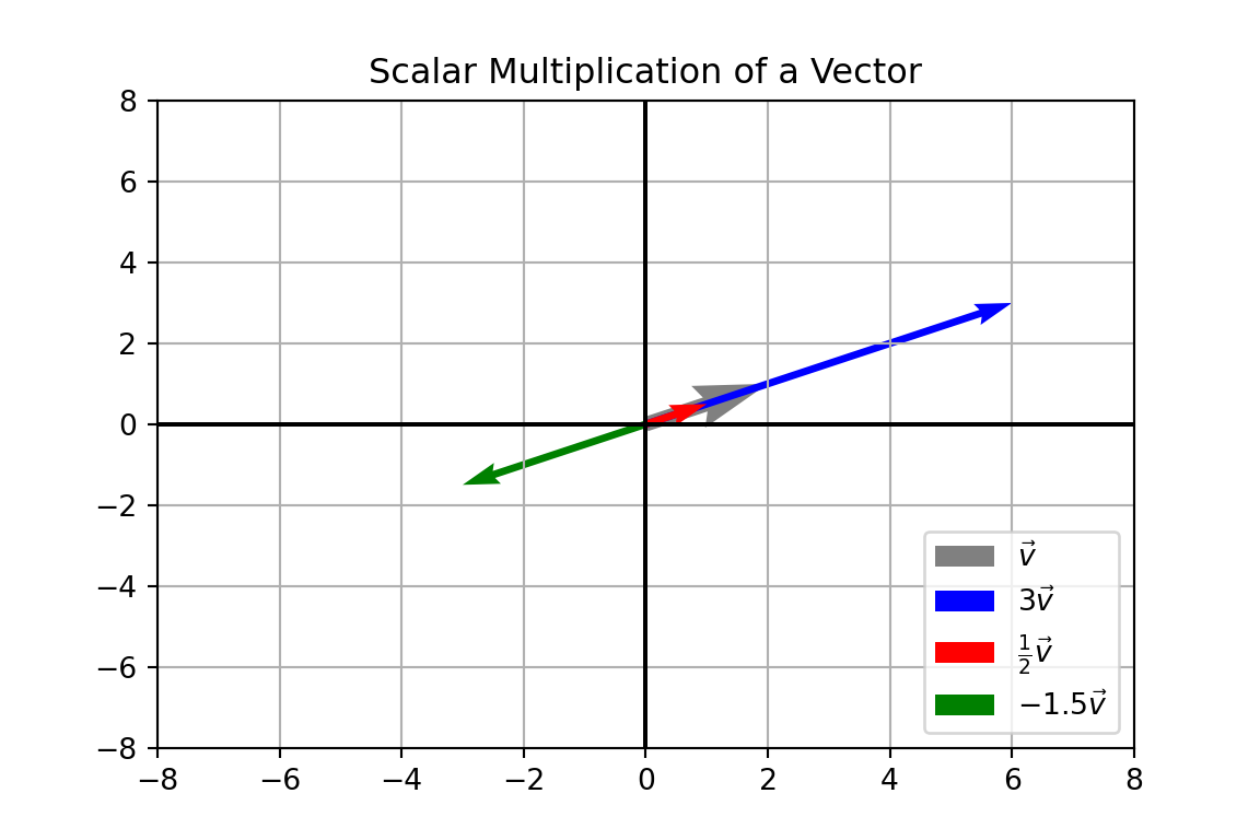 Example: Consider the vector \(\vec{v} = \begin{bmatrix} 2\\ 1\end{bmatrix}\) and scalars \(a_1 = 3\), \(a_2 = 0.5\), and \(a_3 = -1.5\).
