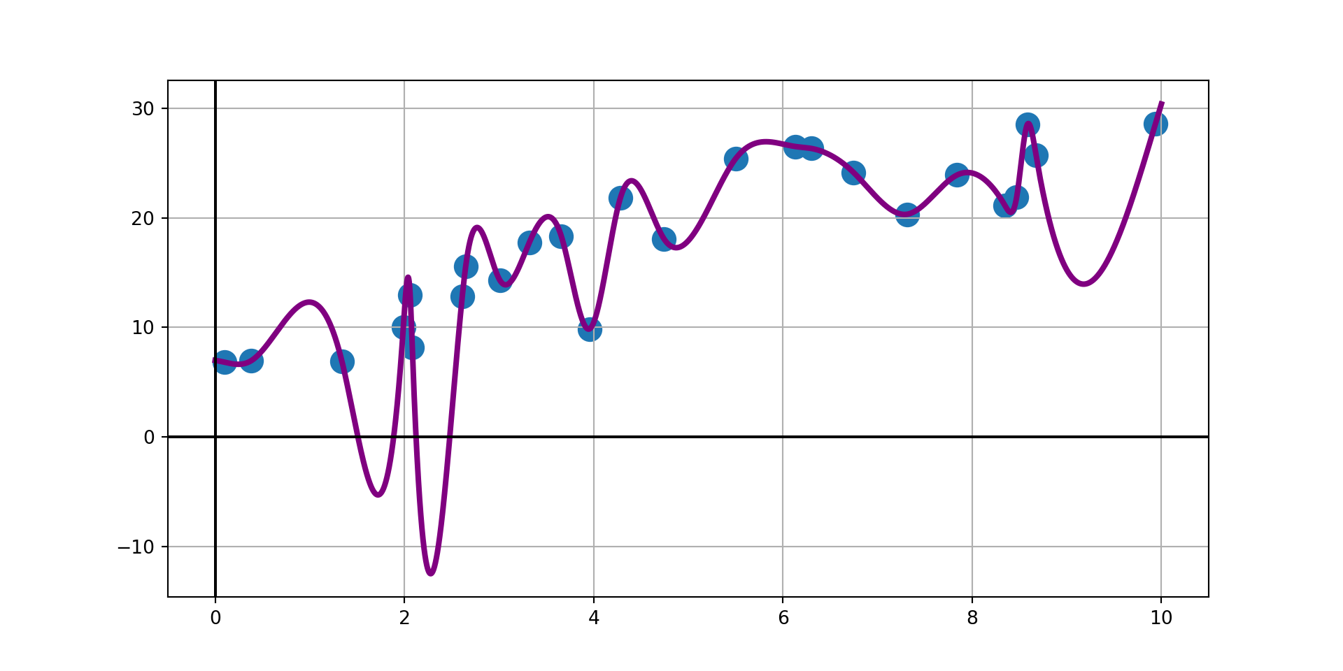The interpolant is doing exactly what its designed to do – pass through every observed data point exactly, but that forces unsupported variability (even with using a cubic spline interpolant). We probably don’t realistically expect new data to follow the interpolant – the model on the right is more conservative, but likely more trustworthy.