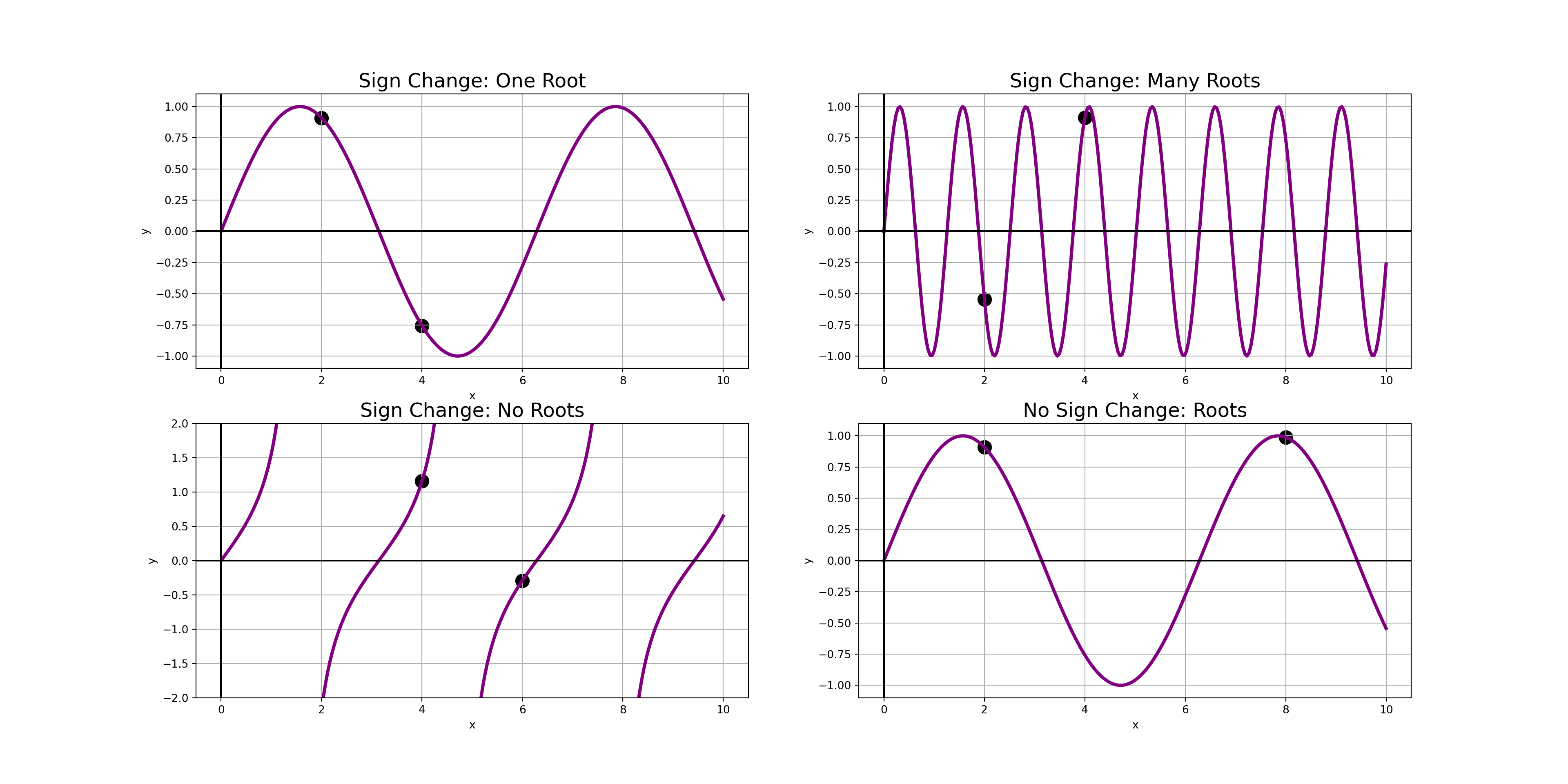 Given the images we’ve seen so far, if we assume that our function is continuous over an interval, then we can find a simple criteria that guarantees the presence of at least one root – a sign change.