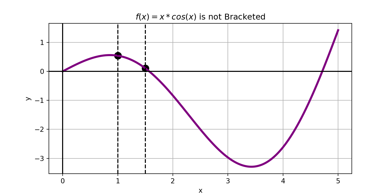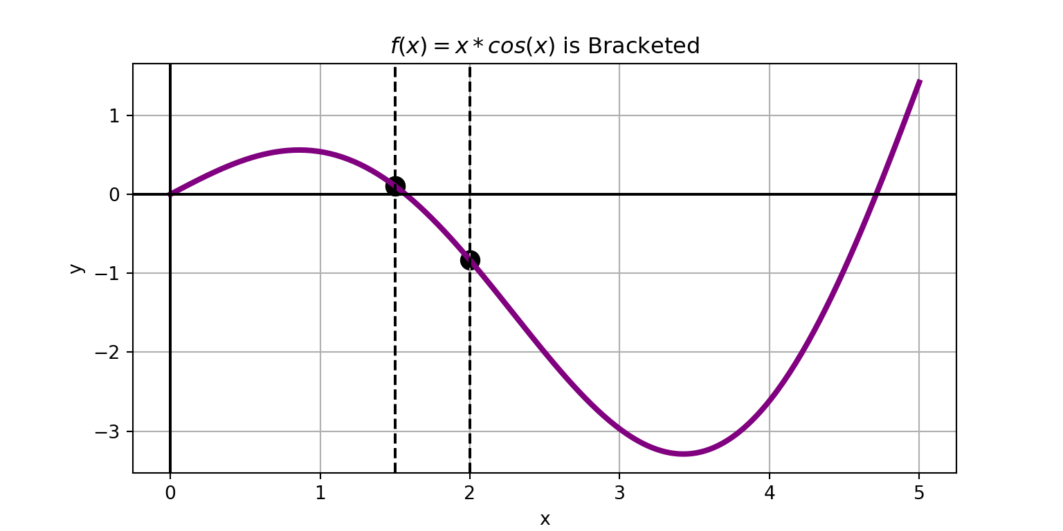 The function \(f\left(x\right) = x\cos\left(x\right)\) is bracketed on the interval \(\left[1.5, 2\right]\).