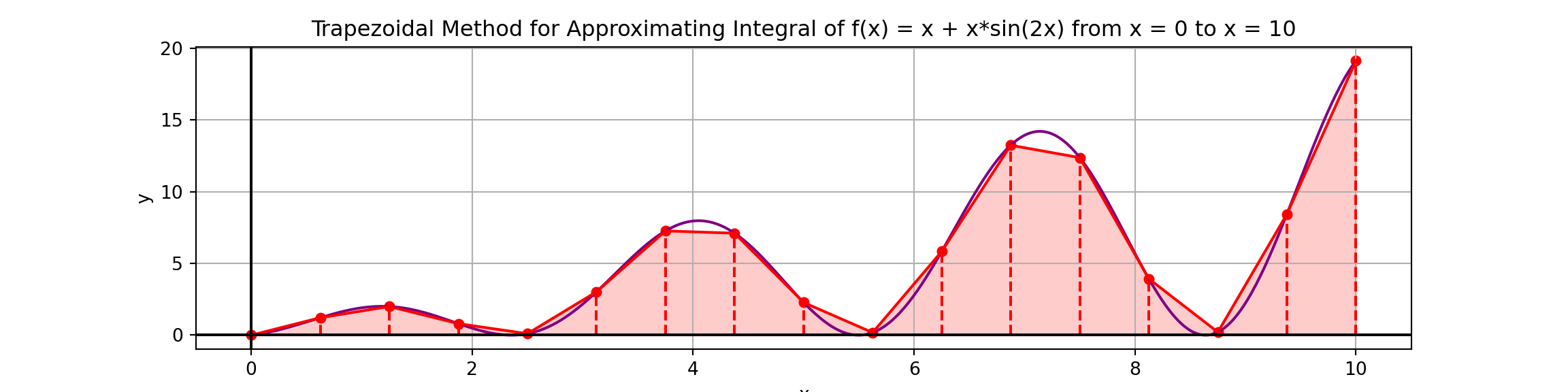 trapezoidMethod() routine.Example: The picture below shows the trapezoidal rule with \(16\) subintervals being used to approximate \(\displaystyle{\int_{0}^{10}{x + x\sin\left(2x\right)dx}}\). Use the routine defined on the previous slide to compute the estimated area.
