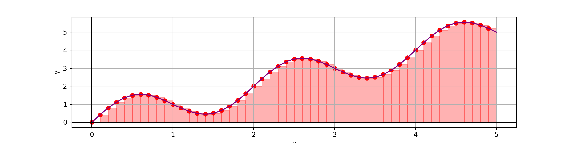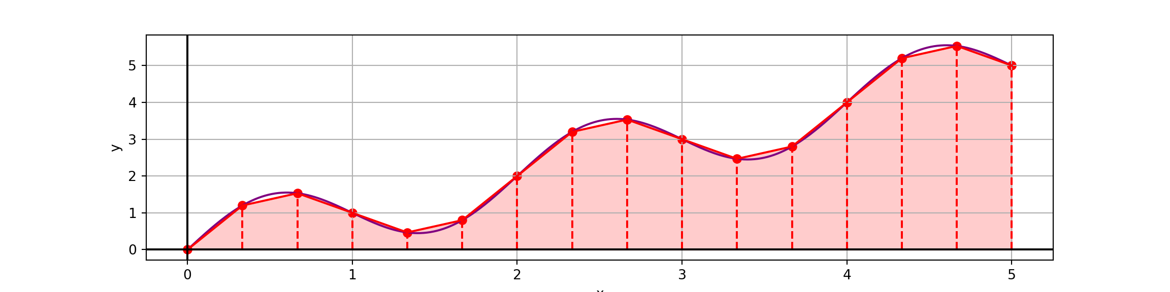 \[\int_{a}^{b}{f\left(x\right)dx} \approx \sum_{i = 0}^{n-1}{\frac{f\left(x_i\right) + f\left(x_{i+1}\right)}{2}\Delta x}\]