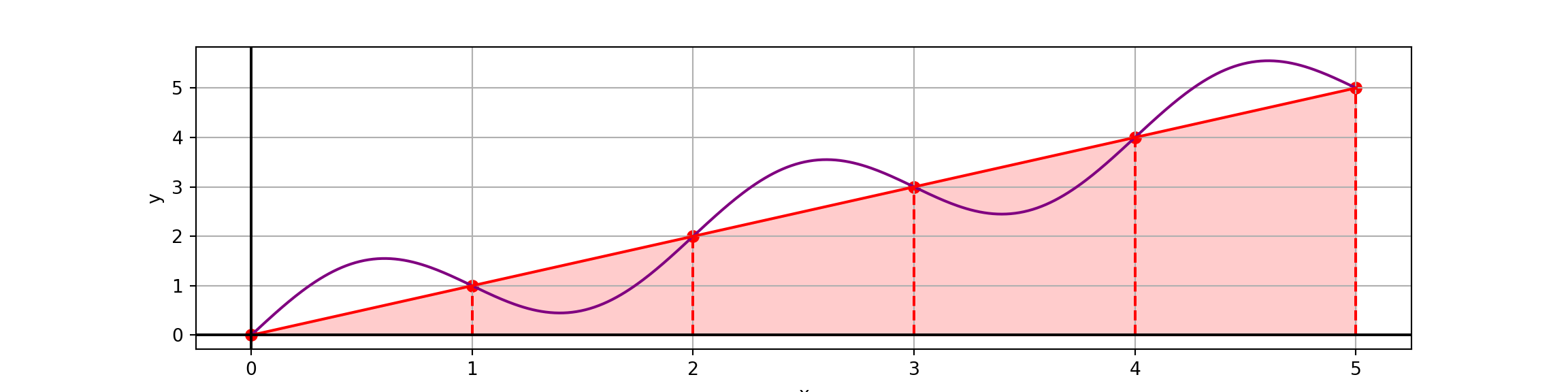 The trapezoid rule that we usually think of (and the one from our earlier plots) breaks up the interval \(\left[a, b\right]\) into many sub-intervals and use a trapezoid on each interval, summing the areas of all of the trapezoids together in order to approximate the area.
