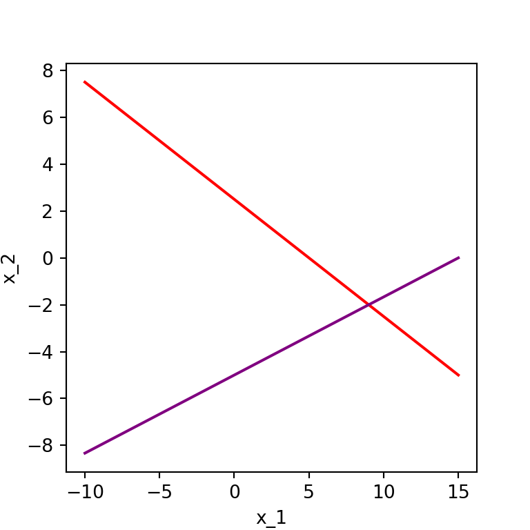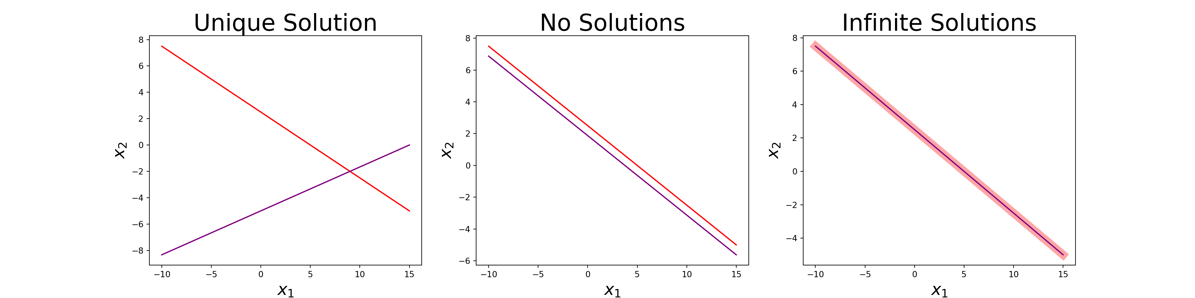 We can see that the system \(\left\{\begin{array}{rcl} 2x_1 + 4x_2 &= & 10\\ x_1 - 3x_2 &= & 15\end{array}\right.\) has a single solution from the plot. You may also remember that systems can also have no solutions or infinitely many solutions. For example, the system \(\left\{\begin{array}{rcl} 2x_1 + 4x_2 &= & 10\\ 4x_1 +8x_2 &= & 15\end{array}\right.\) has no solutions, and the system \(\left\{\begin{array}{rcl} 2x_1 + 4x_2 &= & 10\\ -4x_1 - 8x_2 &= & -20\end{array}\right.\) has infinitely many solutions, as can be seen in the middle and right plot respectively below.