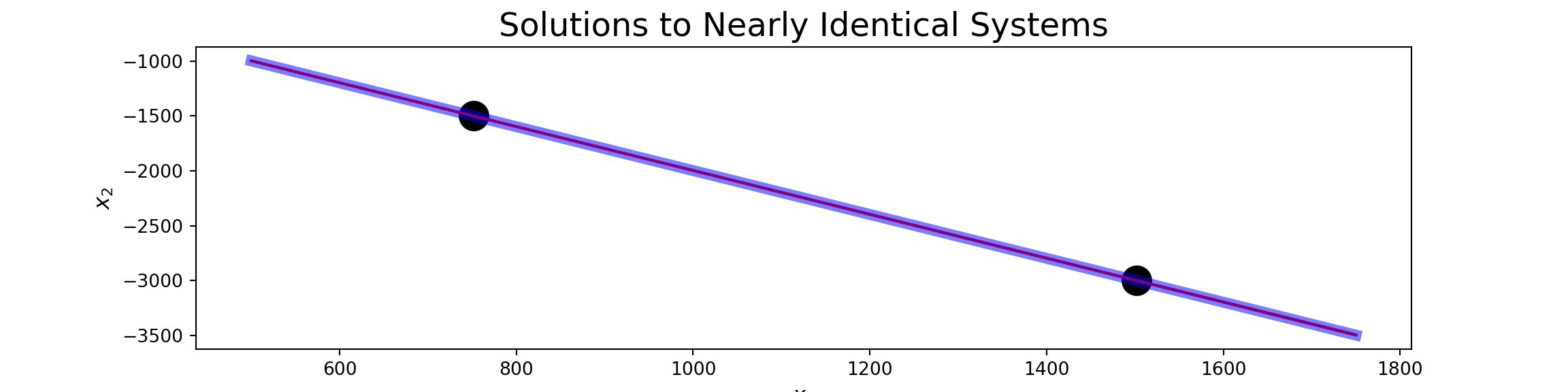 This determinant is close to \(0\) and is on a much smaller scale than the coefficients of the system. We’ll use this as a rule of thumb.