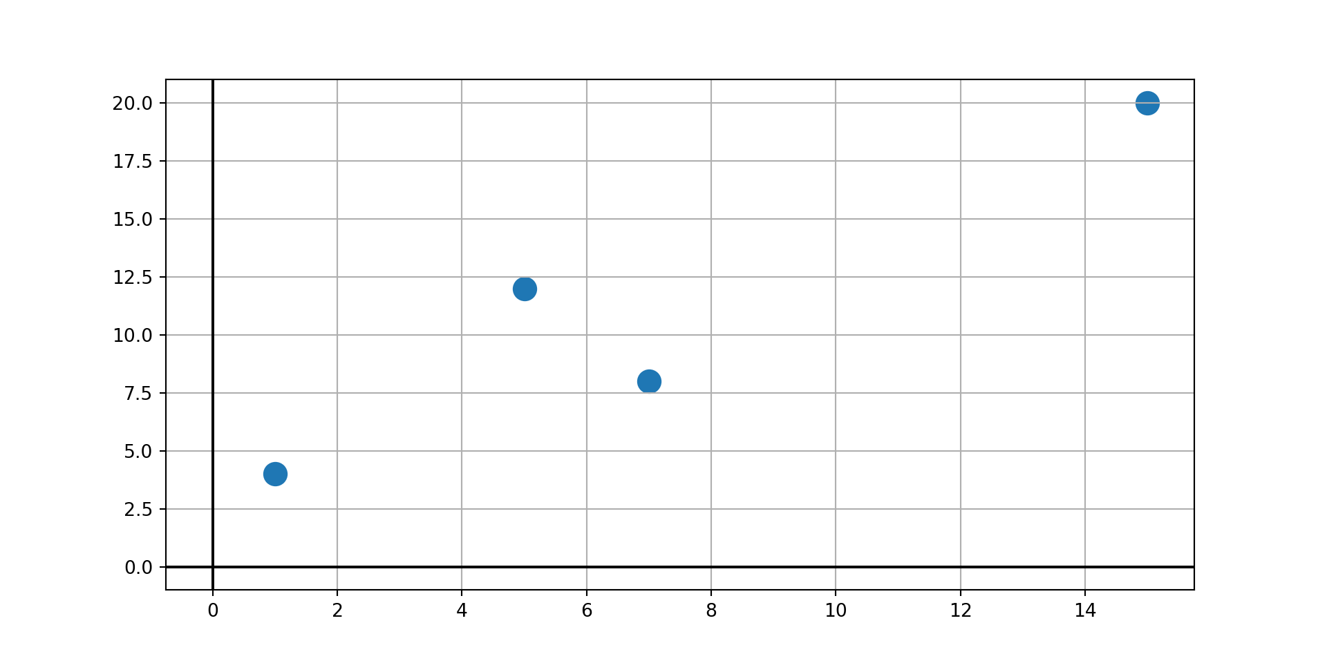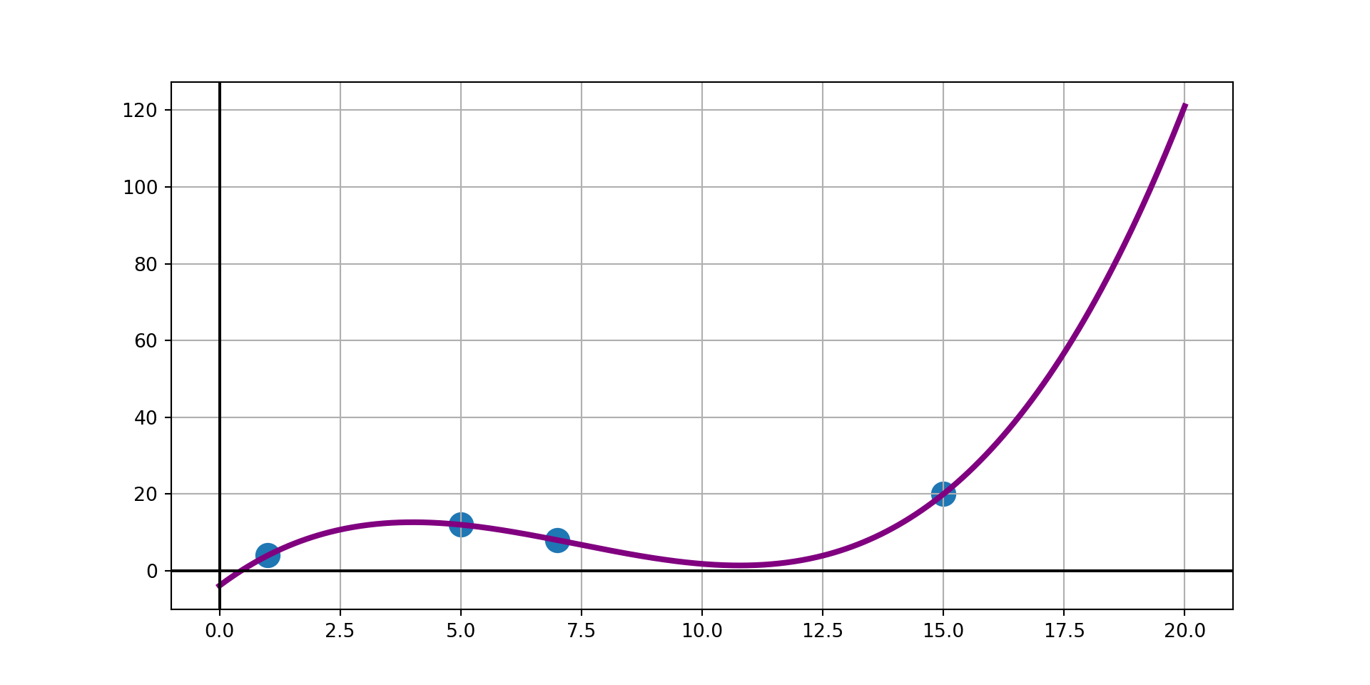return term1 + term2 + term3 + term4Example: Use Lagrange’s Method to find a third degree polynomial interpolant through the observed data points \(\left(1, 4\right)\), \(\left(5, 12\right)\), \(\left(7, 8\right)\), and \(\left(15, 20\right)\).