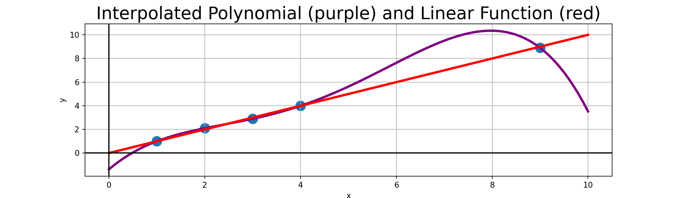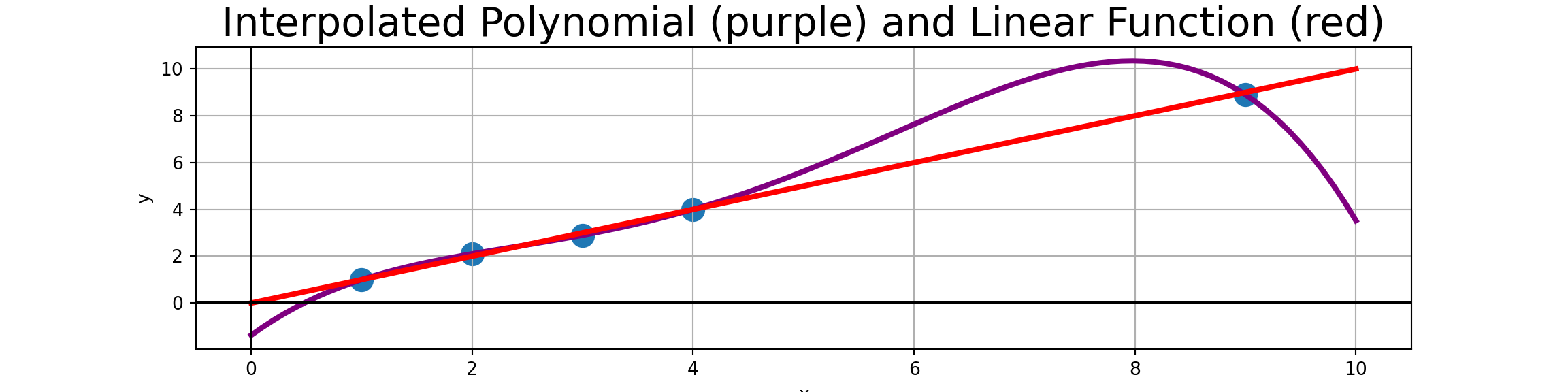 We can see that the interpolated polynomial has emphasized bends to accommodate the “measurement error”. Interpolated values for \(4 < x < 9\) should almost surely not be trusted.