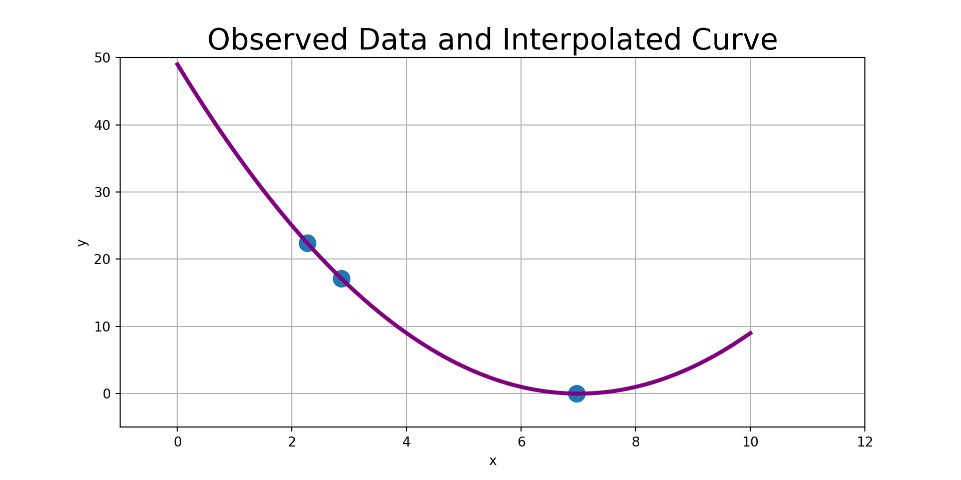 General Rule 2: Polynomial interpolation should be carried out with the fewest number of data points feasible. For example, if you suspect that your polynomial should be degree \(2\), then use three data points. An interpolated polynomial passing through more than \(6\) observed data points should be viewed with extreme suspicion – In fact, the more data points used, the more suspicious we should be of our polynomial.