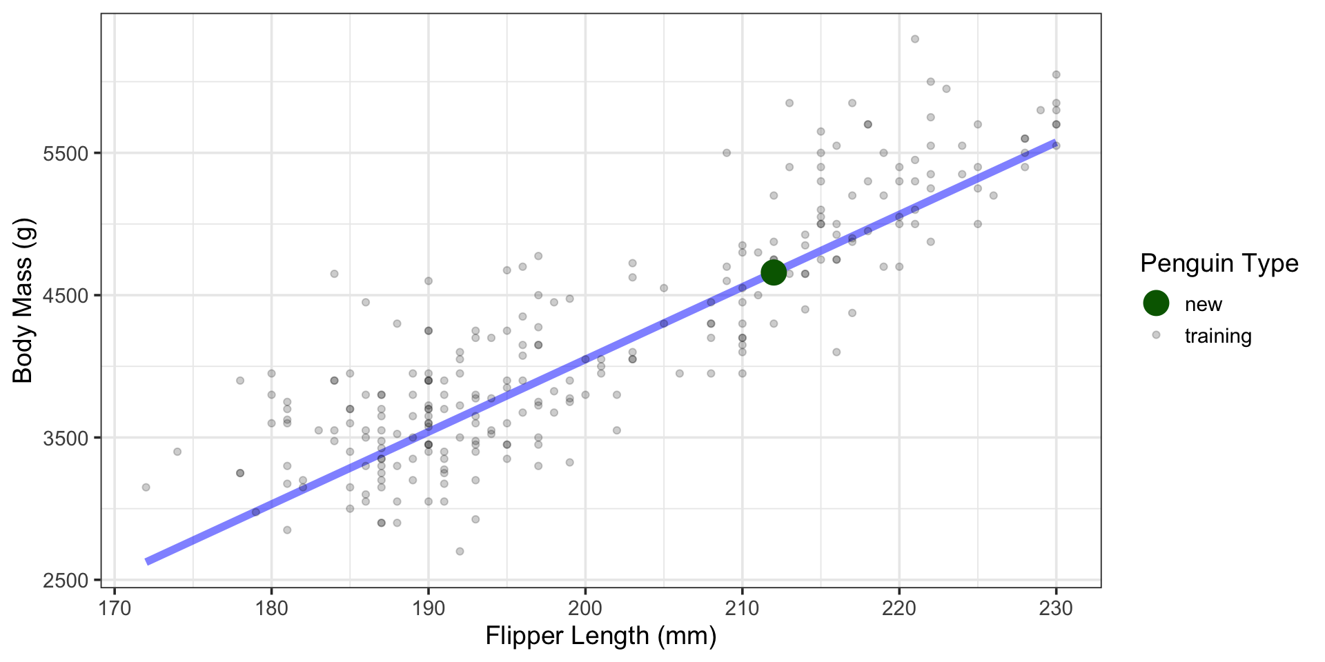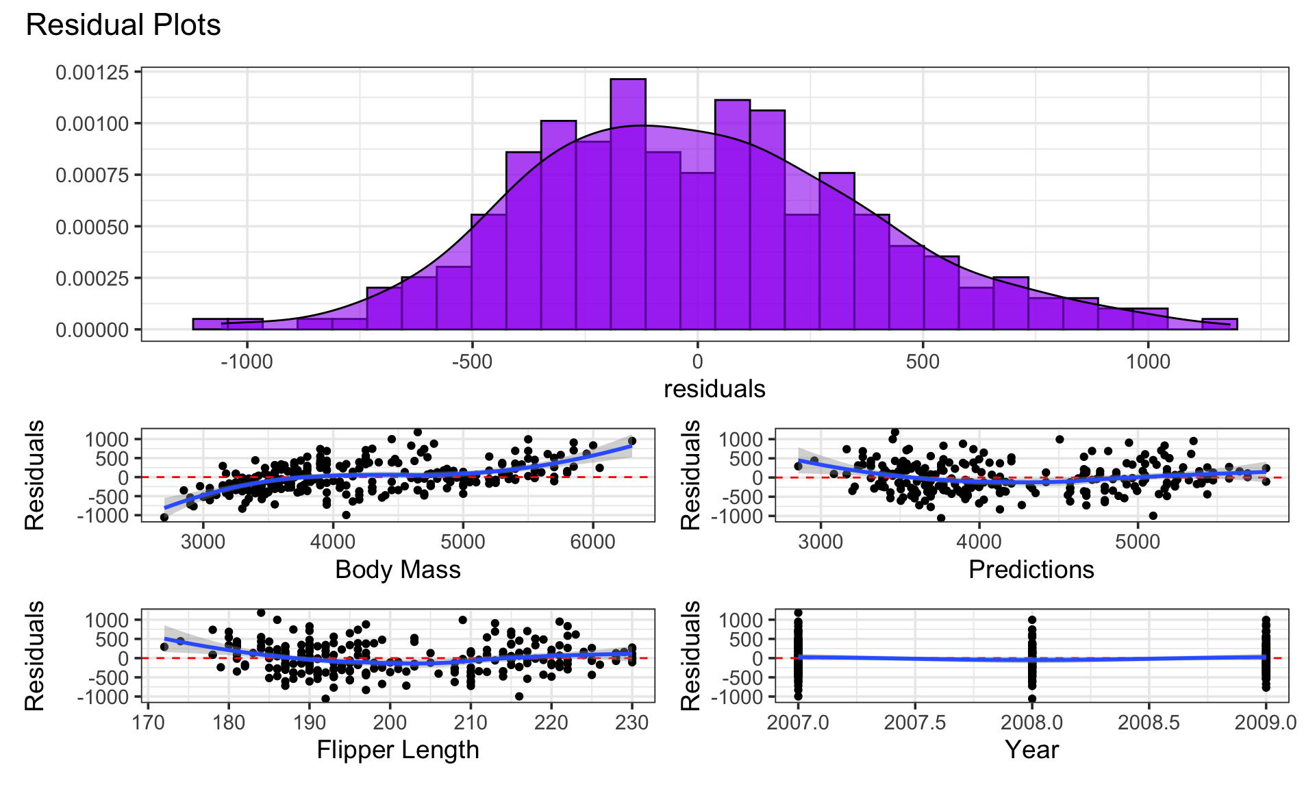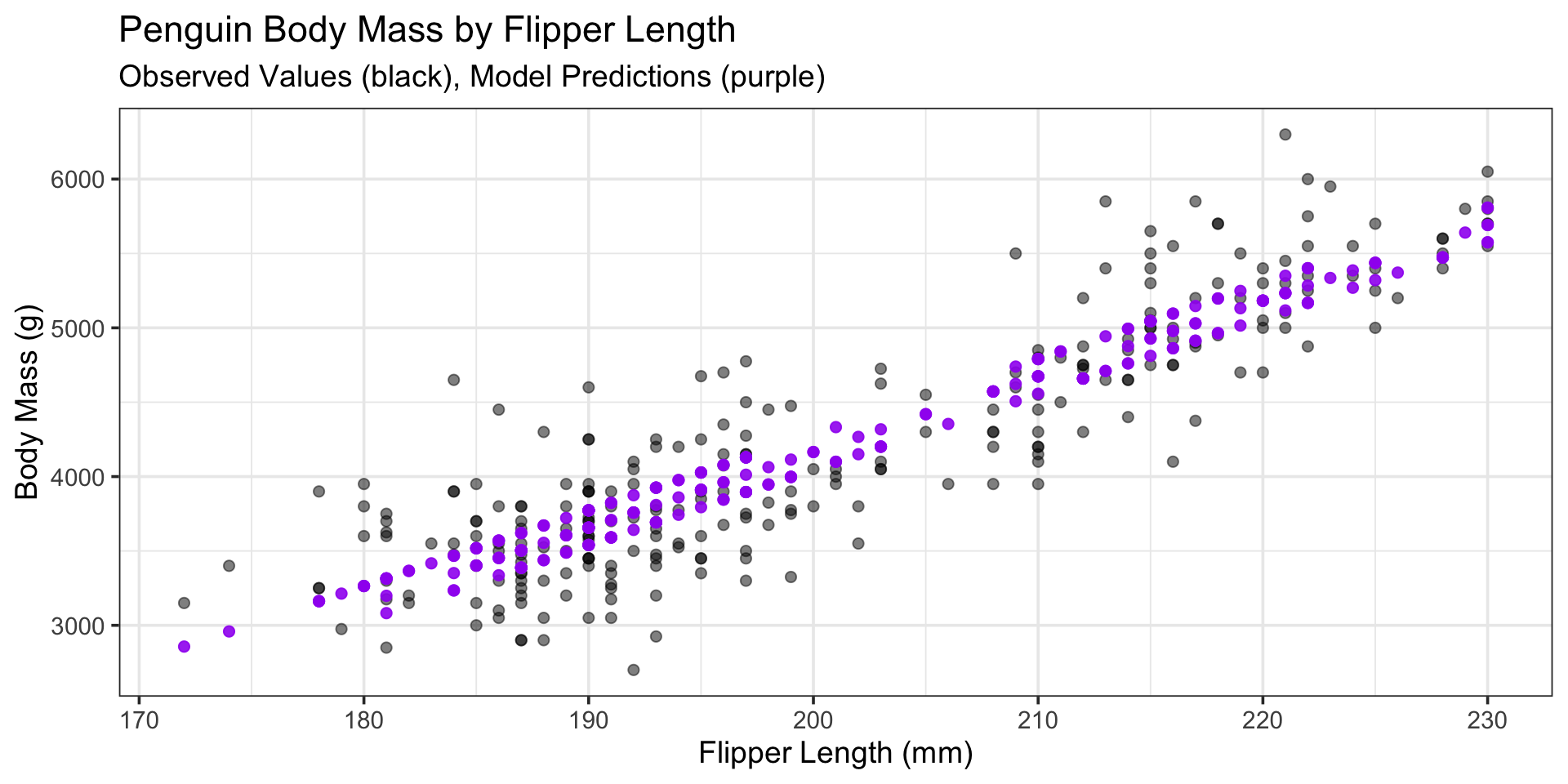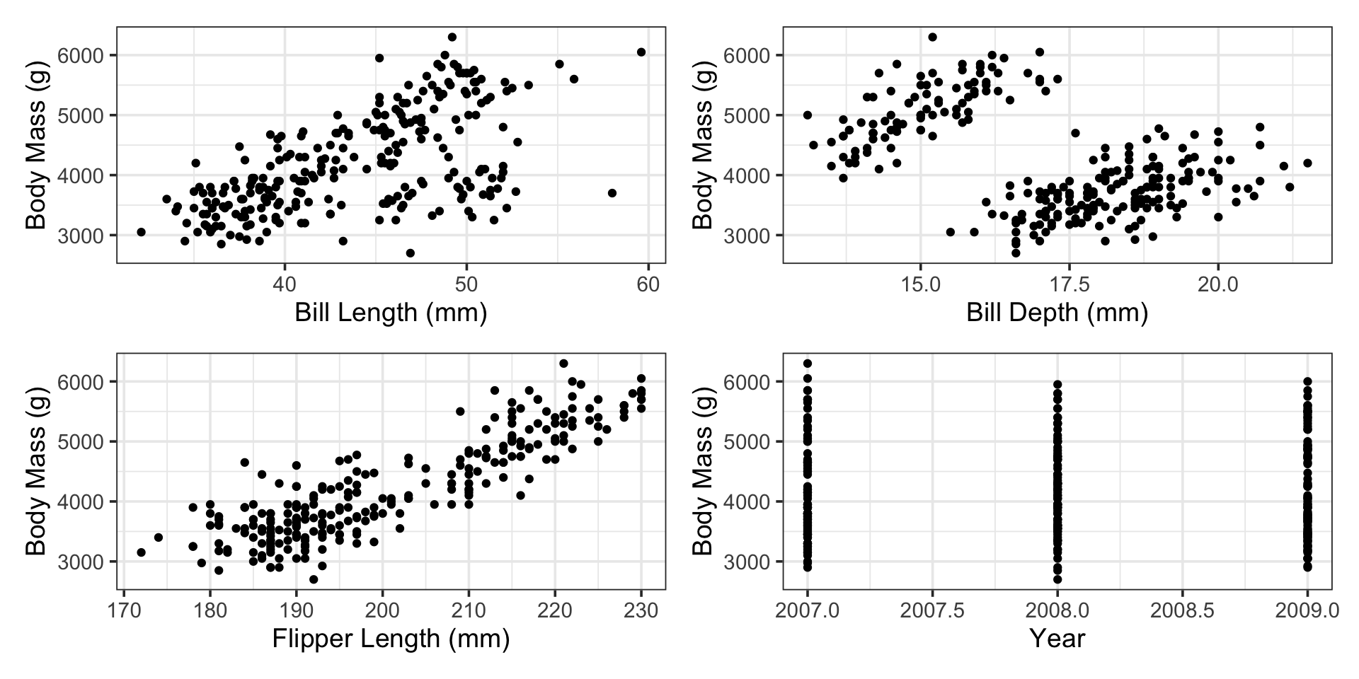 \[\begin{align} \mathbb{E}\left[\text{body mass}\right] = \beta_0 + &\beta_1\cdot\left(\text{bill length}\right) + \beta_2\cdot\left(\text{bill depth}\right) +\\ & \beta_3\cdot\left(\text{flipper length}\right) + \beta_4\cdot\left(\text{year}\right)\end{align}\]