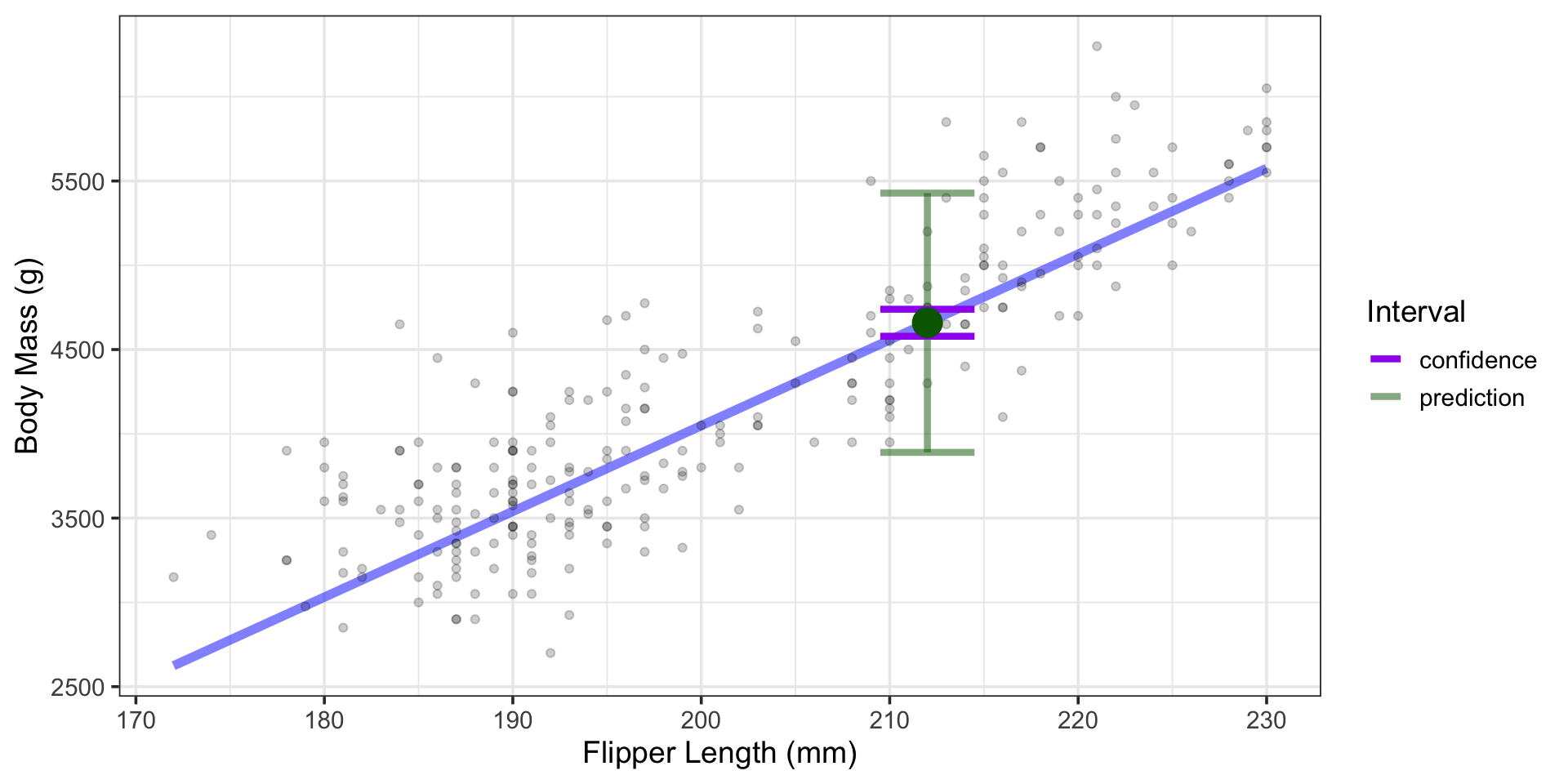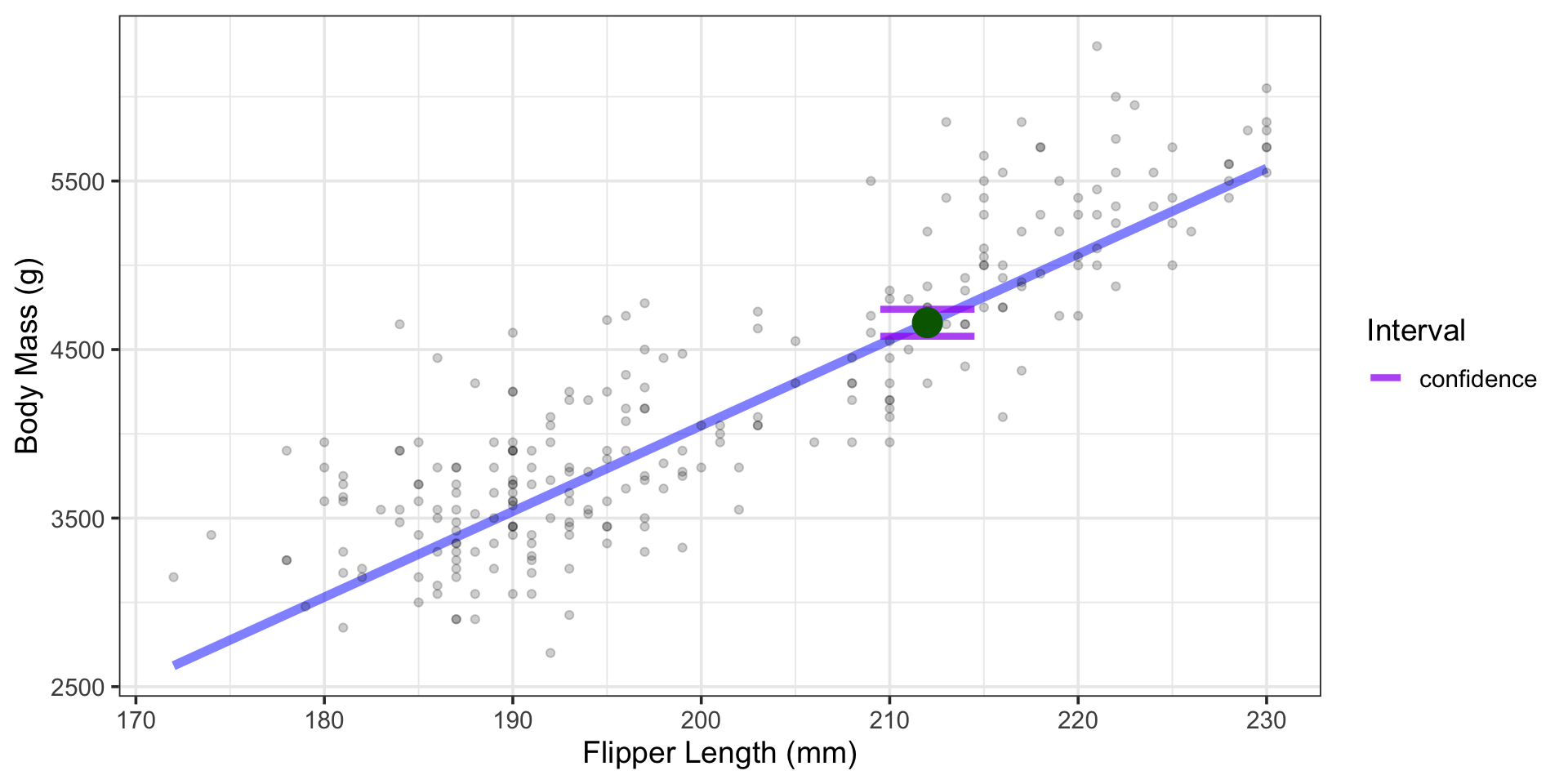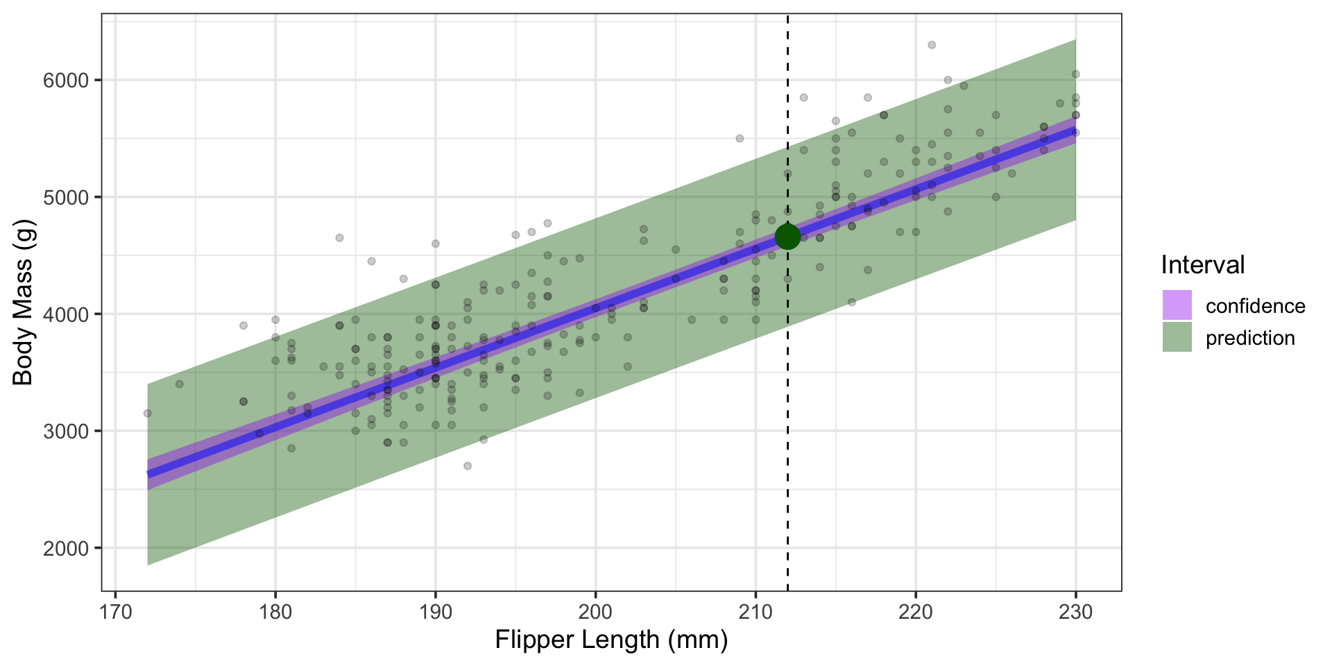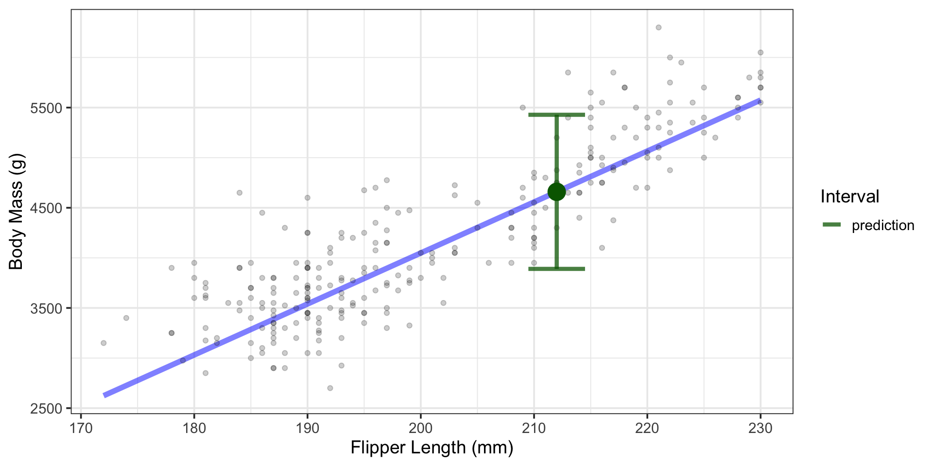 We are 95% confident that a single randomly selected penguin from 2009 with a flipper length of 212mm will have a body mass between about 3890g and 5428g.