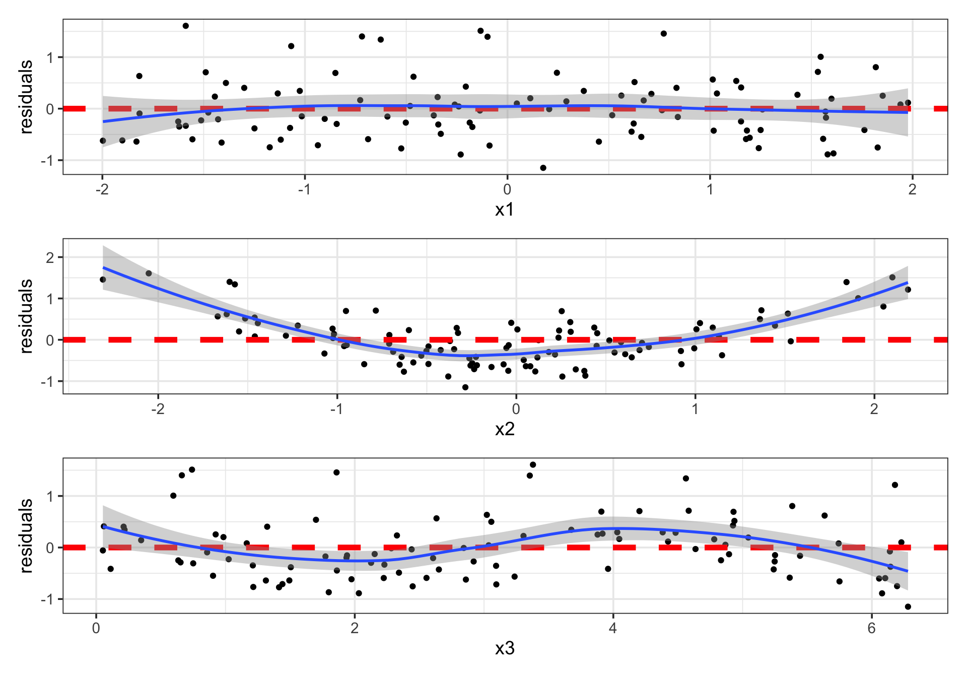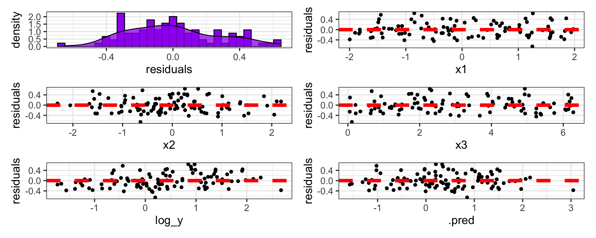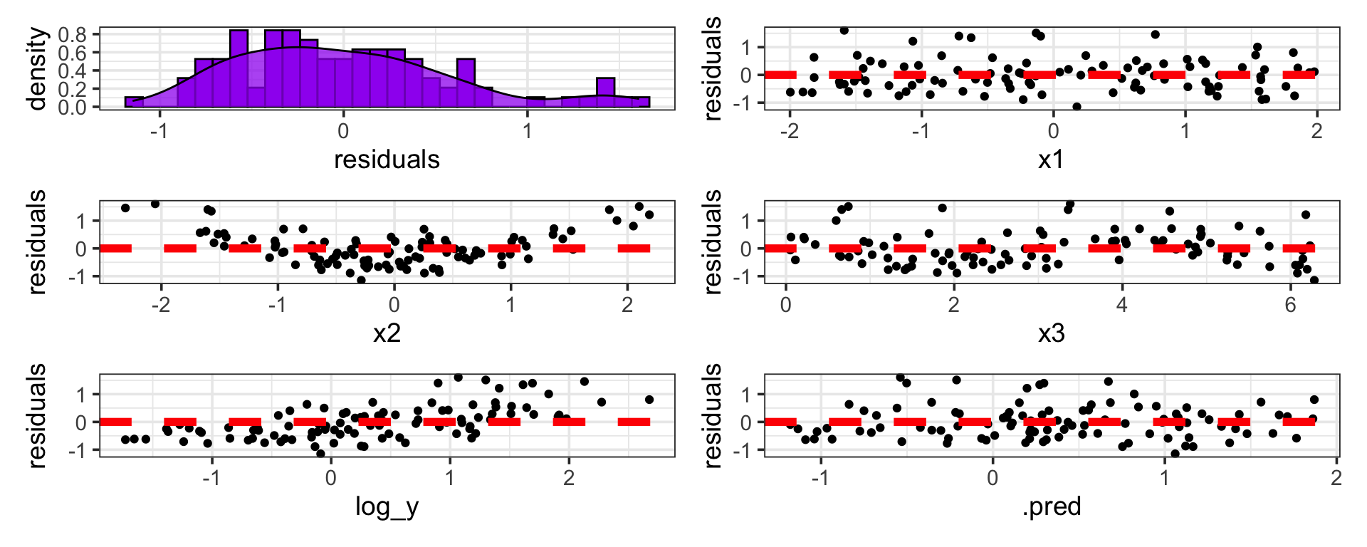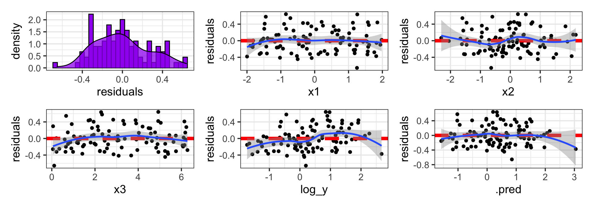 As a reminder, in the residual plots below, we’ve chosen to model the logarithm of \(y\) instead of modeling \(y\) directly. We’ve also included a quadratic term corresponding to the x2 predictor and we’re using sin(x3) in the model instead of x3 directly.