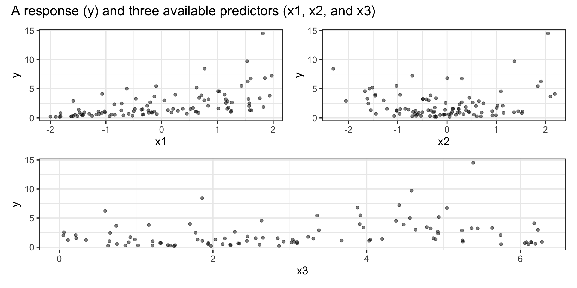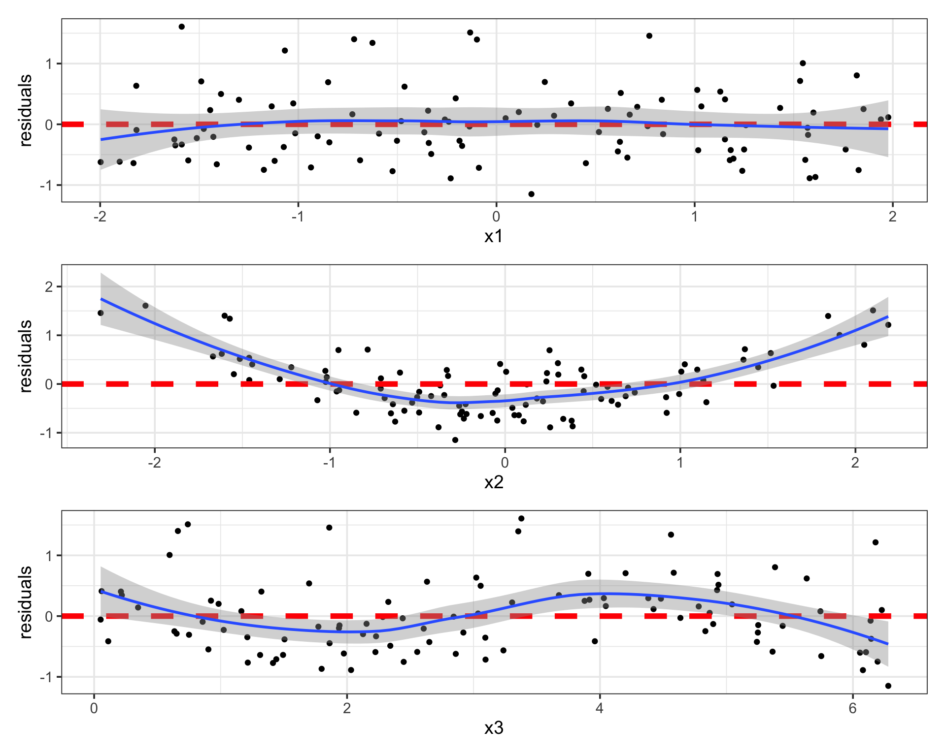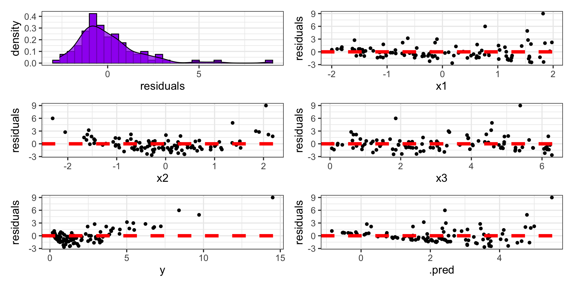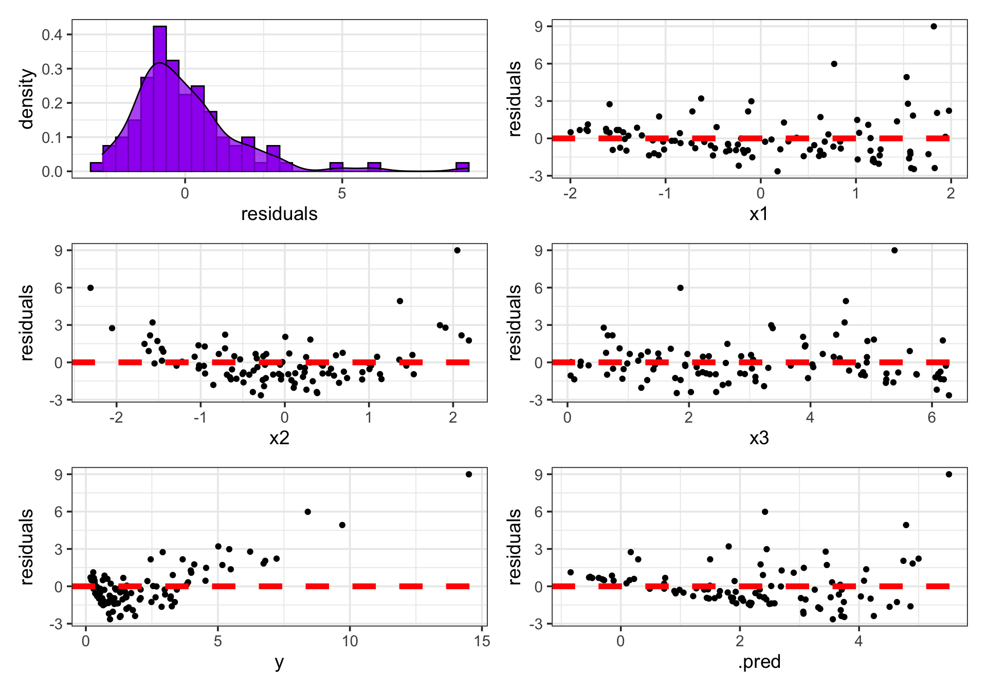 As a reminder, in the residual plots below, we’ve chosen to model the logarithm of \(y\) instead of modeling \(y\) directly. We’ve also included a quadratic term corresponding to the x2 predictor and we’re using sin(x3) in the model instead of x3 directly.
