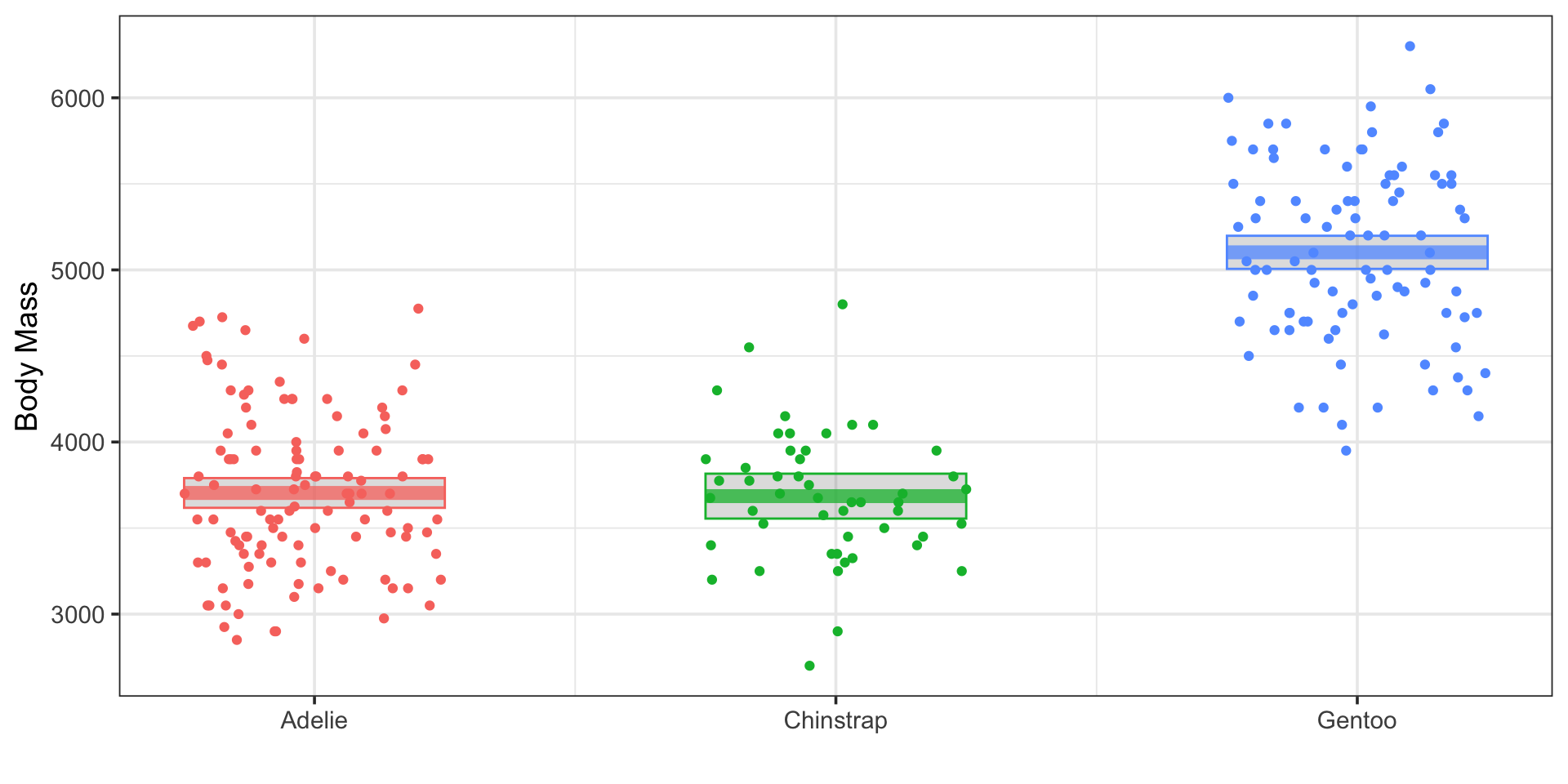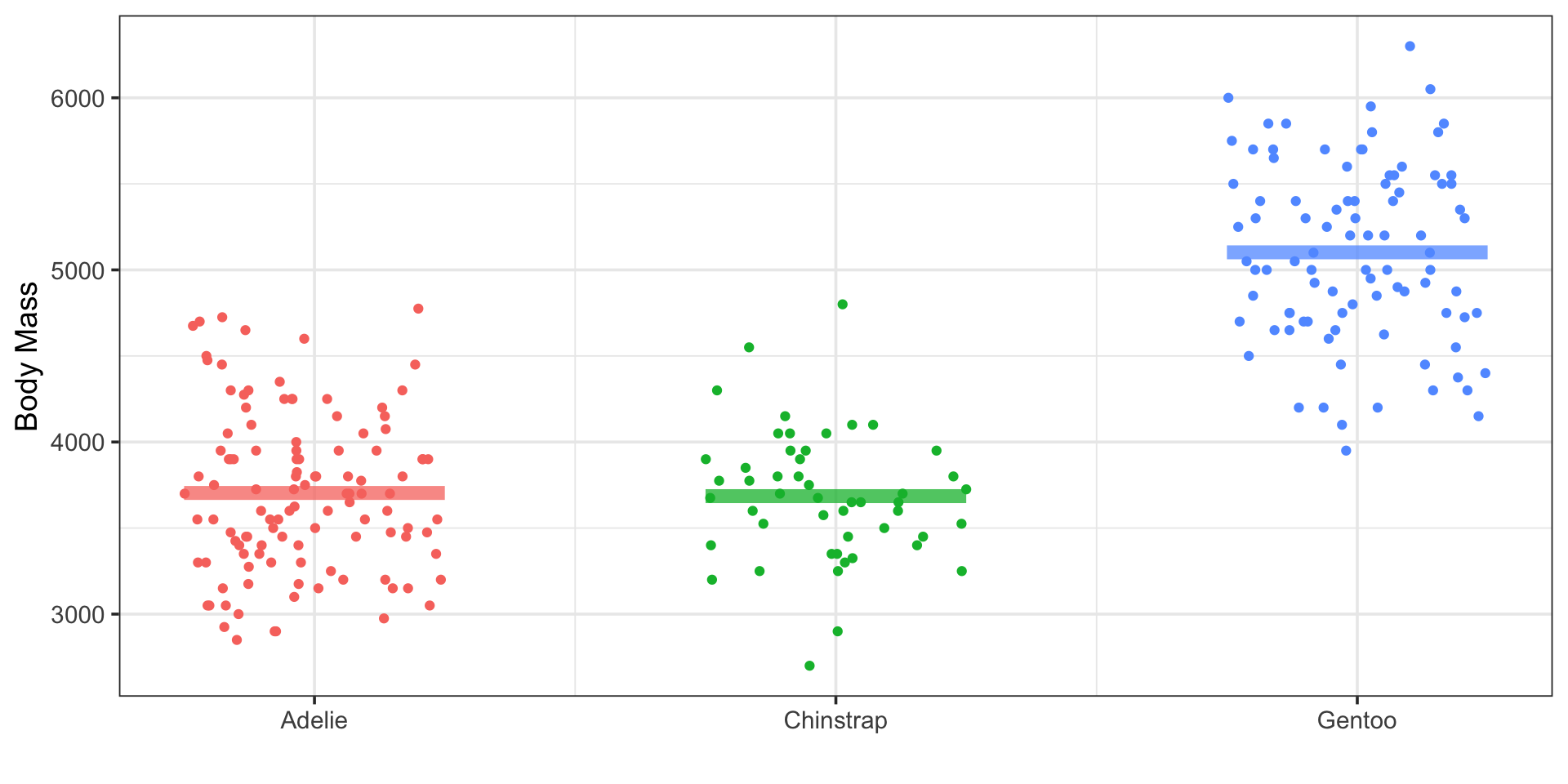 \[\mathbb{E}\left[\text{body mass}\right] = \beta_0 + \beta_1\cdot\left(\text{species}\right)\]
