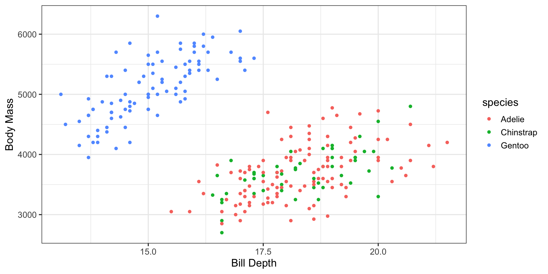 aes(x = bill_depth_mm, y = body_mass_g, color = species),