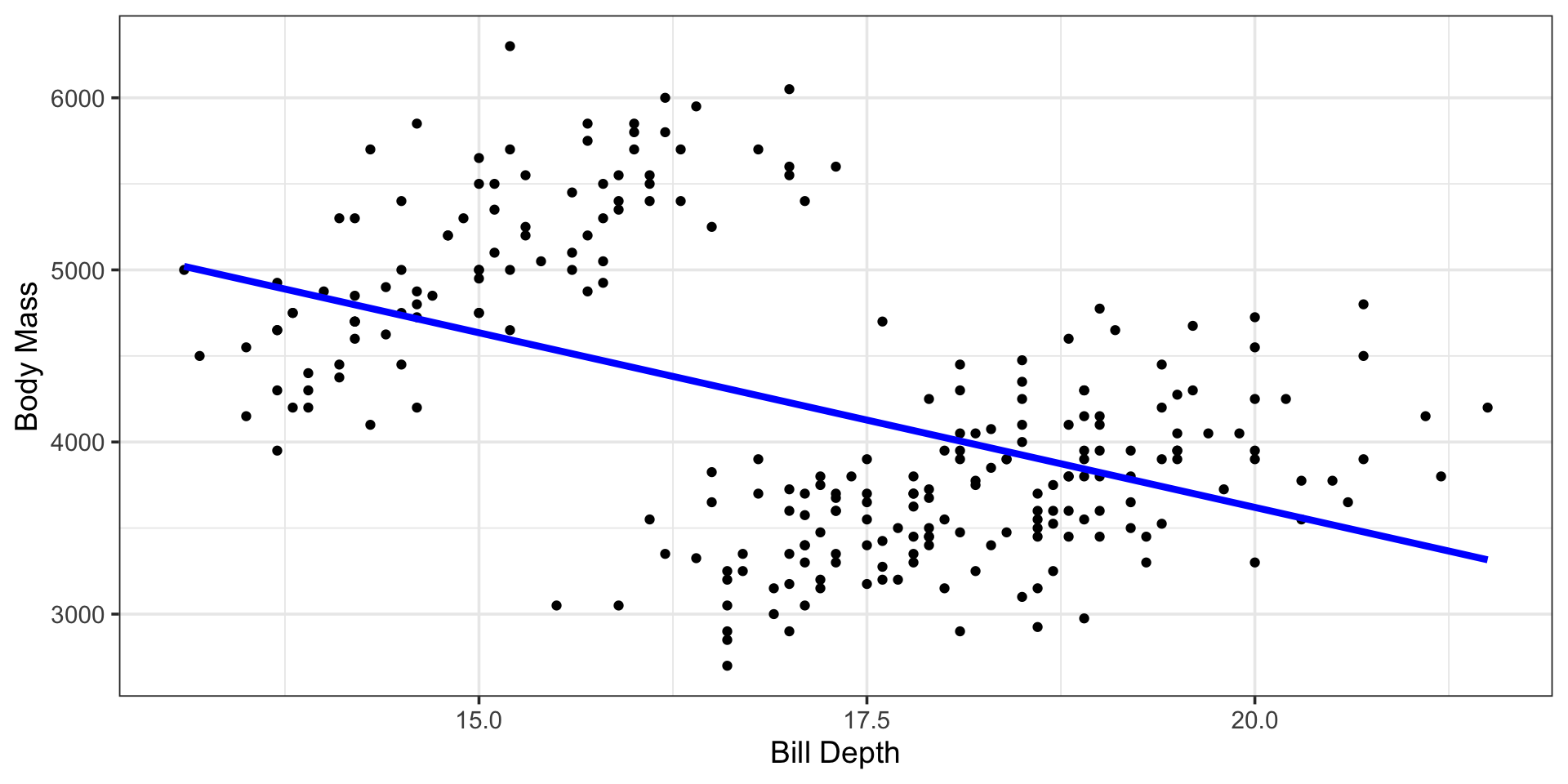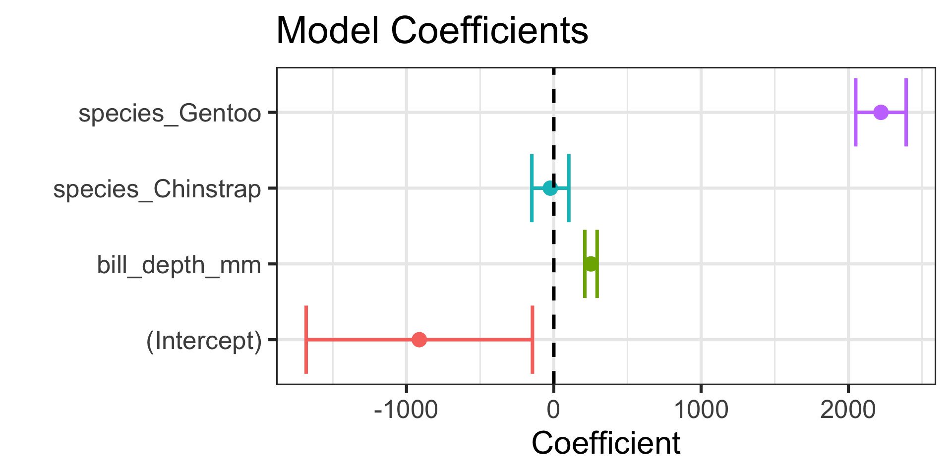 (Intercept) Interpretation of this intercept is not meaningful because it would correspond to a penguin with a bill depth of 0mm.