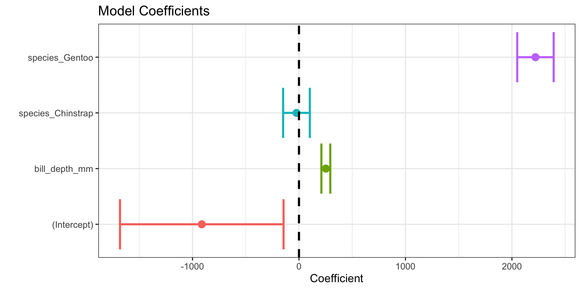 Note: The interpretations for these \(\beta\)-coefficients on the species dummy variables are not as slopes. They are direct adjustments to the expected body mass, accounting for differences in species. The intercept in this model is the predicted response for the base level.