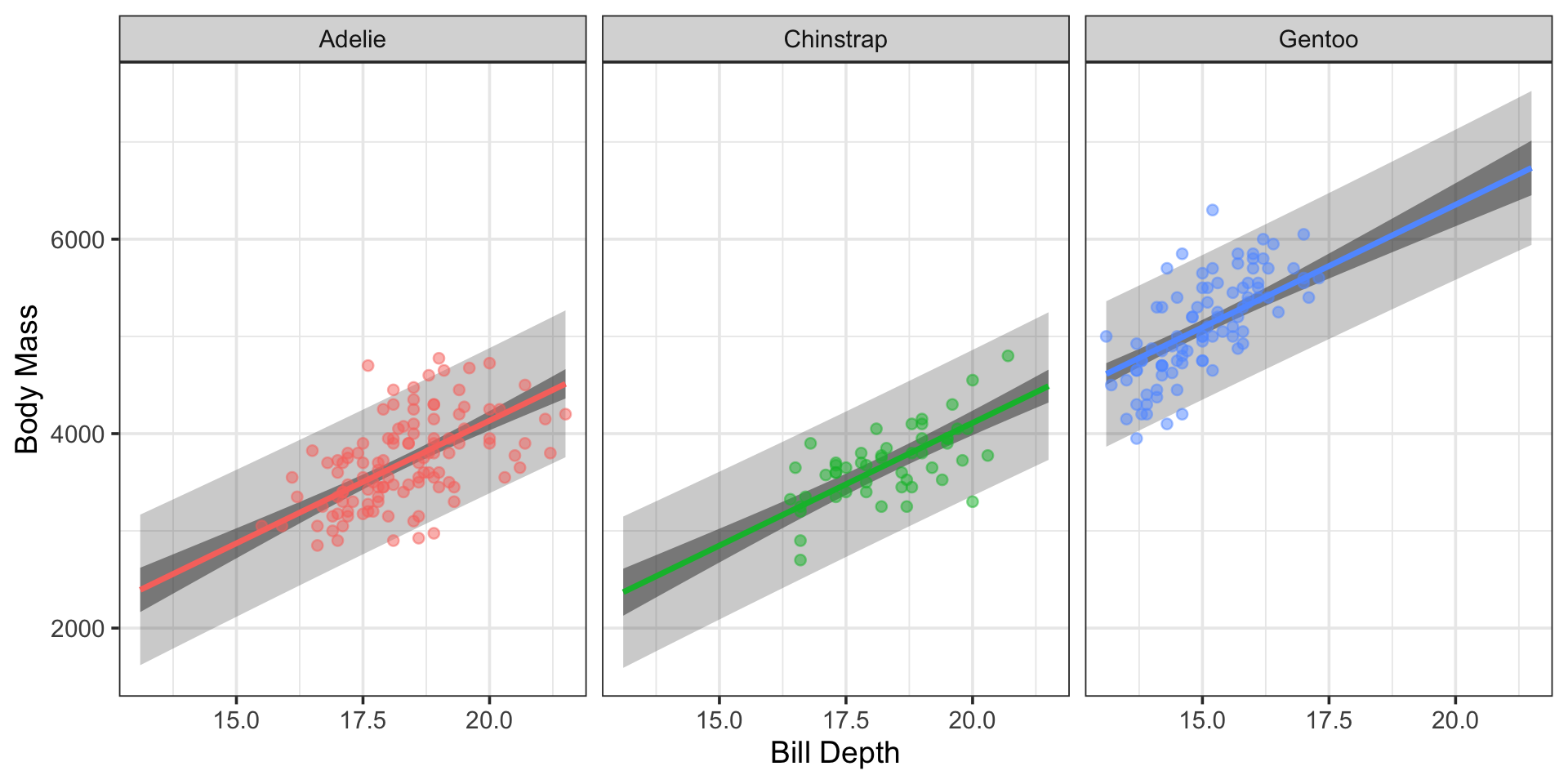 Note: Controlling for differences in bill depth, the average body mass for Gentoo and Adelie penguins is statistically discernible, but the body mass of Adelie and Chinstrap penguins is not.