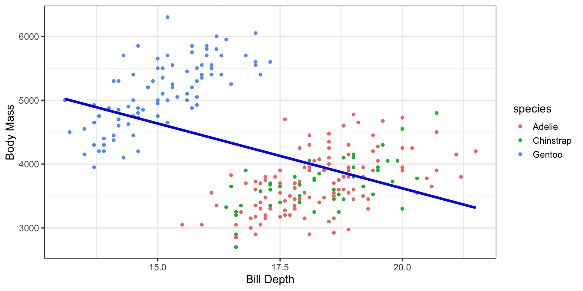 Can we accomodate both bill_depth_mm (a numerical variable) and species (a categorical variable) into a single model?