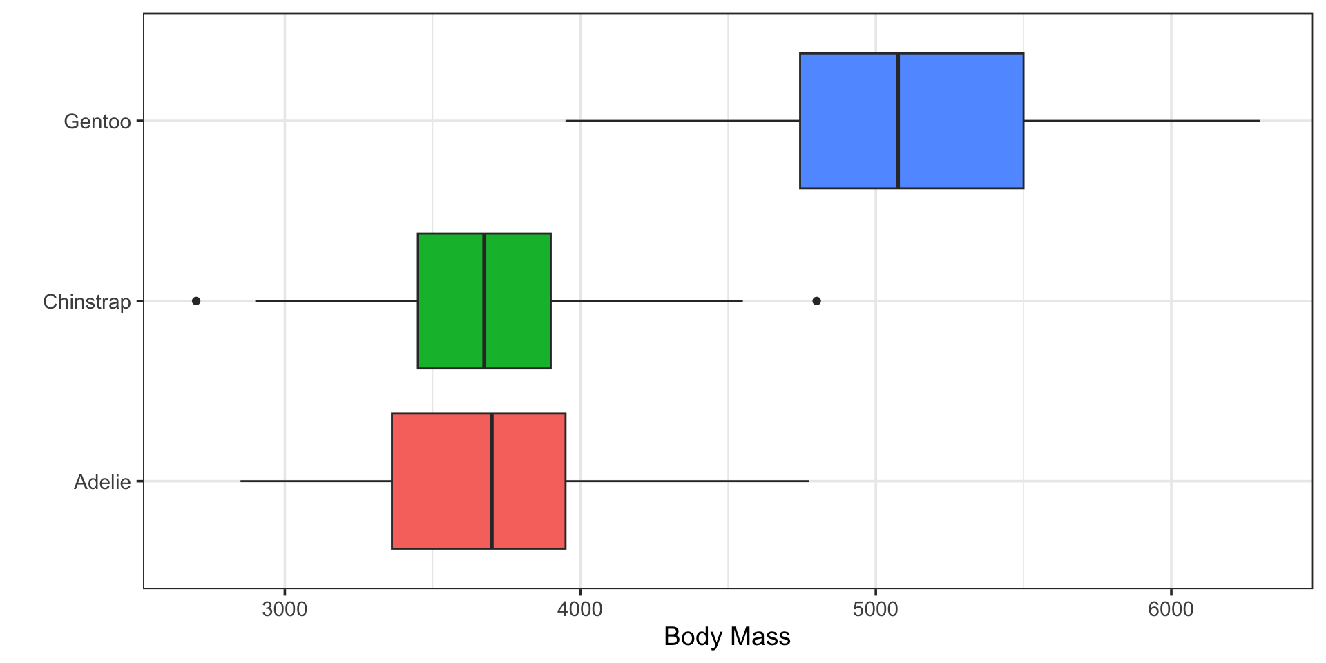 \[\begin{array}{lcl} H_0 & : & \mu_{\text{Adelie}} = \mu_{\text{Chinstrap}} = \mu_{\text{Gentoo}}\\ H_a & : & \text{At least one species has different average body mass}\end{array}\]