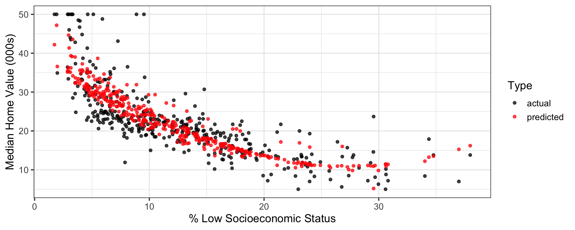 geom_point(aes(x = lstat, y = medv, color = actual),