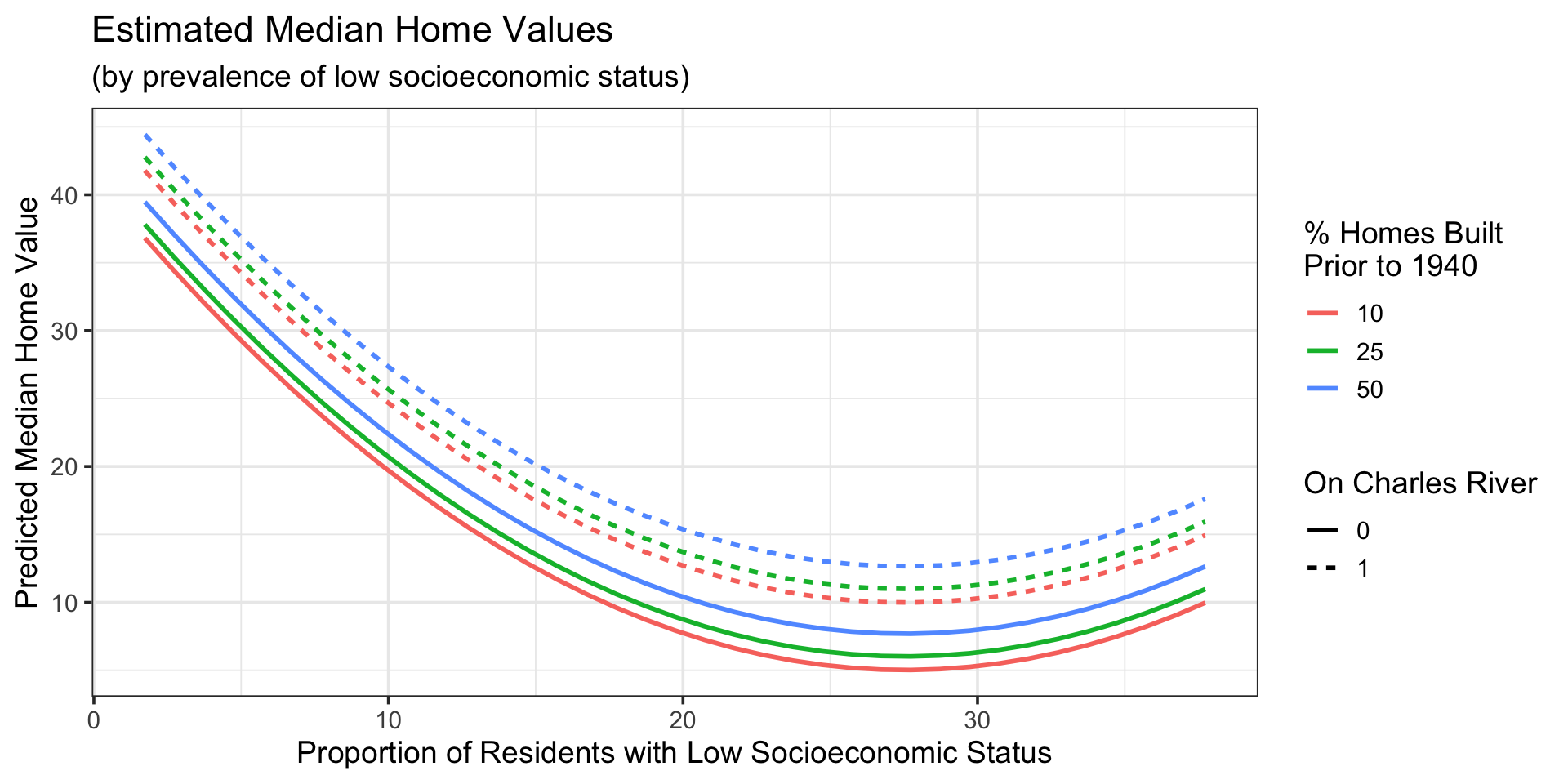 lstat and median home values is not constant!(lstat) Holding the location of a neighborhood relative to the Charles River and the percentage of homes built before 1940, a one percentage-point increase in the percentage of residents of low socioeconomic status is expected to be associated with a change in median home values of about