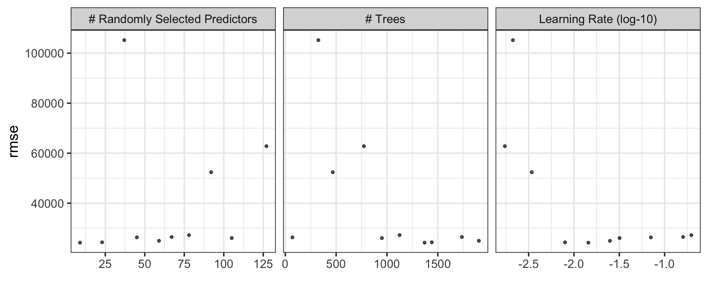 Our best untuned model to predict Sale_Price was a Random Forest that had a cross-validation RMSE of $28,606.09, while this tuned gradient boosting ensemble had a cross-validation RMSE of $24,224.78